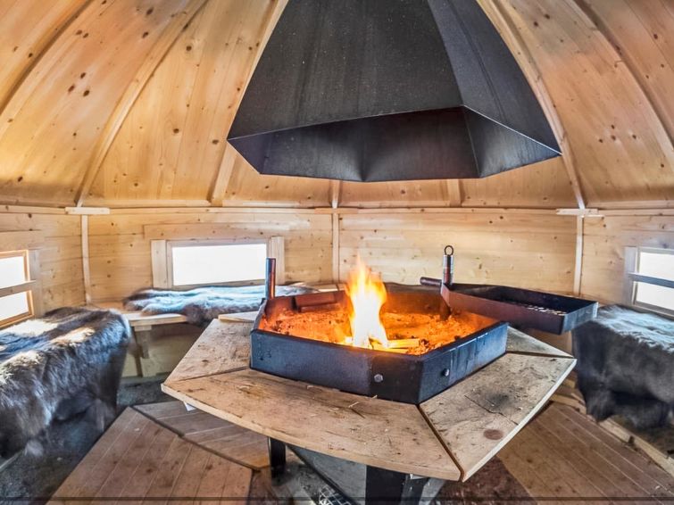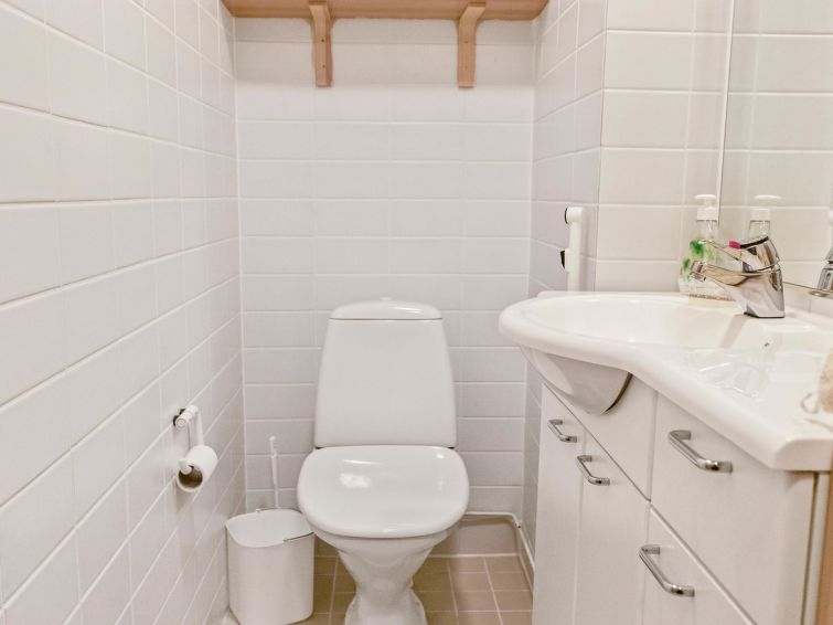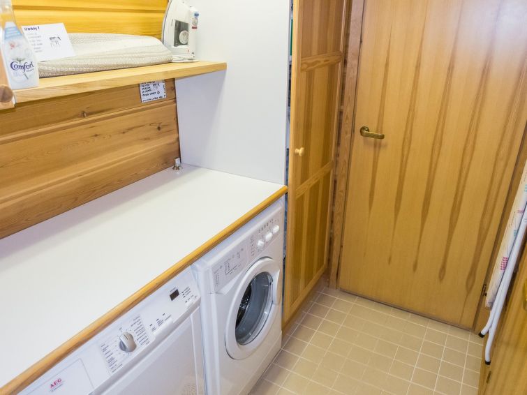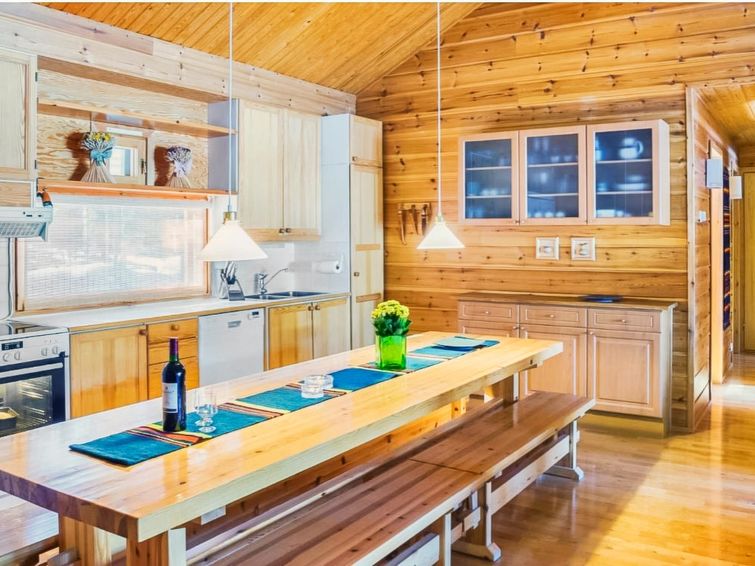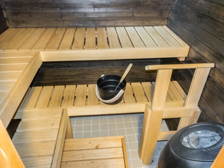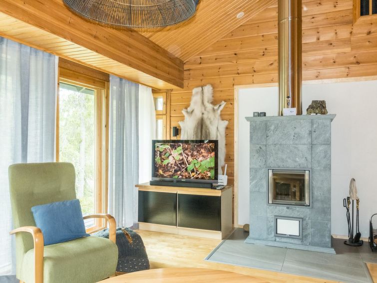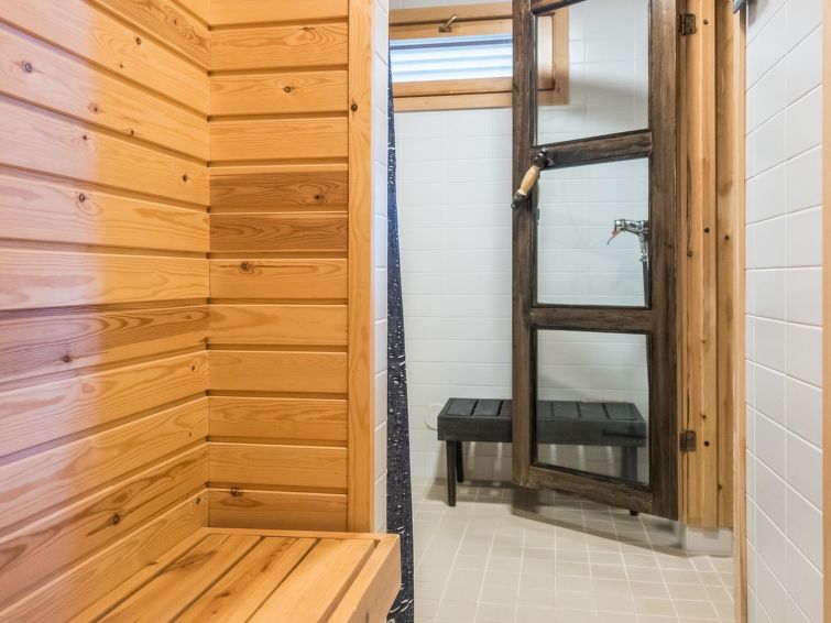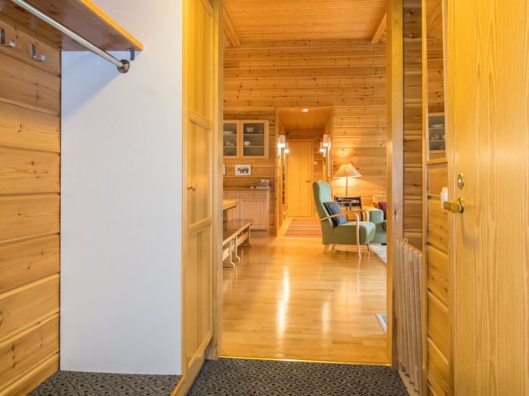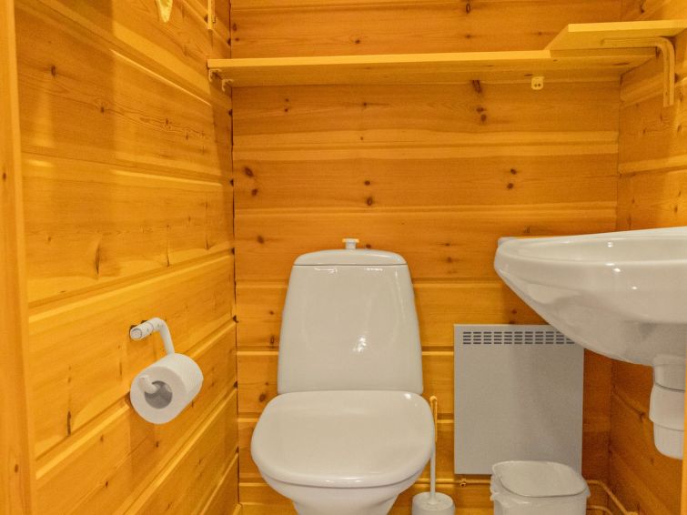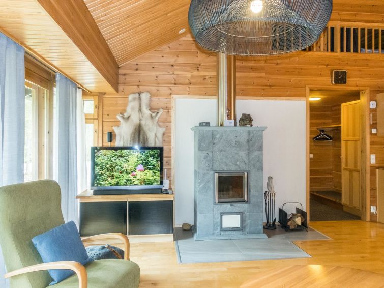 The spacious kitchen, dining area and big living room offer nice facilities to spend time together. There is a necessary kitchen equipment for making food, even for a larger group. The fireplace is creating a nice atmosphere. There are three bedrooms in the cabin, two have double beds and one have two bunk beds. Total area is 104² m plus 17 m² small loft. A Small loft is offering two more sleeping sites. Steep stairs to the loft. Electric sauna can be switched on to wait returning from outdoor activities. Two showers offering comfort to sauna session. A spacious hallway for several shoes and overalls and a drying area for shoes and overalls (instead of a drying cabinet) make your vacation easy and comfortable.Two toilets, washing machine and tumble dryer are helping with holiday practical arrangements. The terrace offers nice possibilities to enjoy of landscapes during the snowless period. There is a shared hut located in the area.