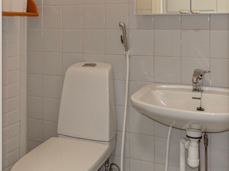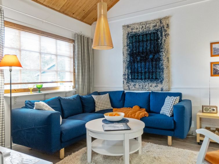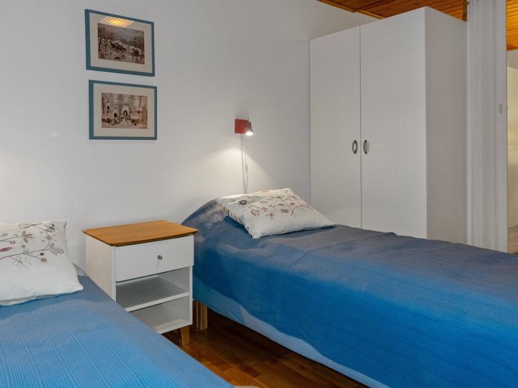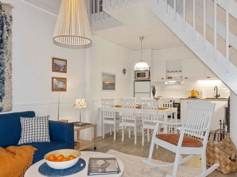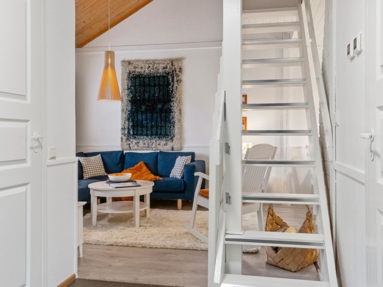 The apartment has a living room/kitchen, bedroom with 2 beds, loft with 2 beds, and an additional bedroom separated by a sliding door on the upper floor, featuring a double bed and access to the bedroom through the loft. Sauna, a shower room, a separate WC, and a storage room. The house was built in 1975, and the apartment was renovated in the autumn of 2023.