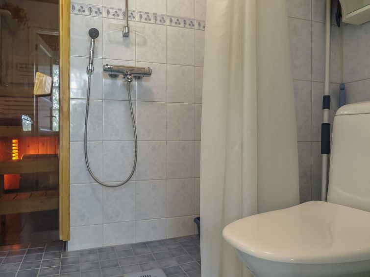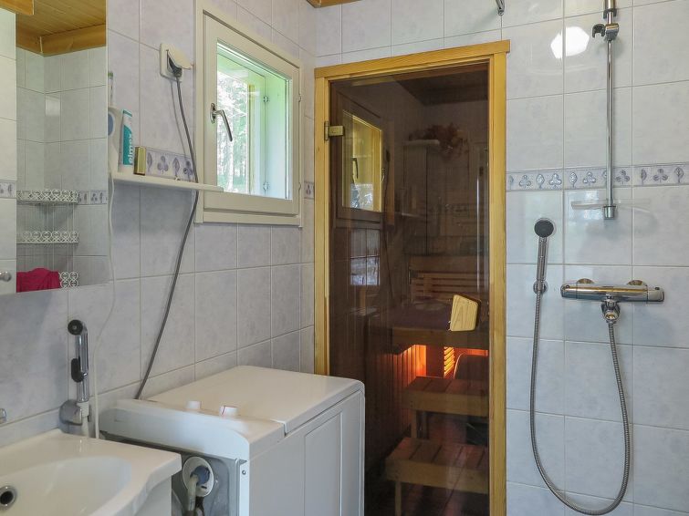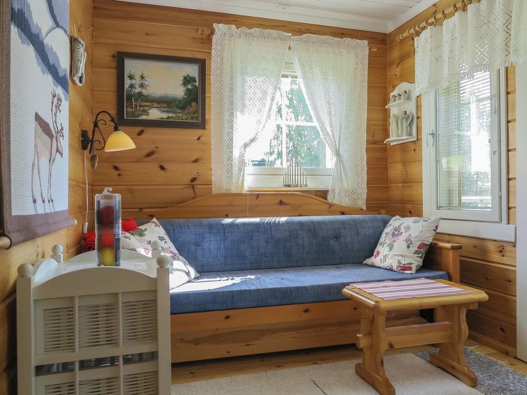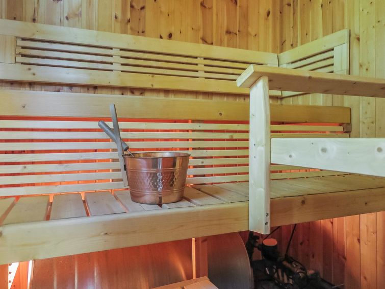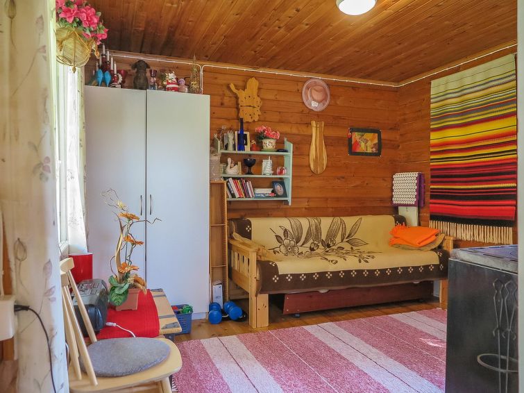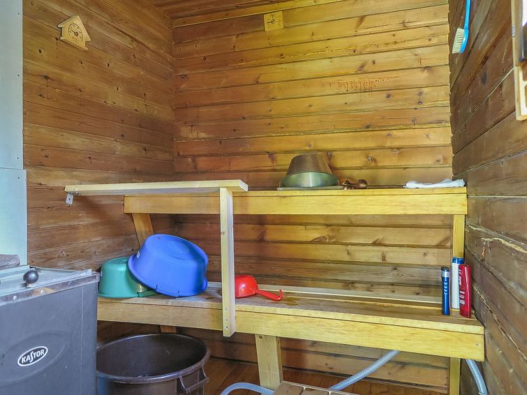 Lakeside sauna available from beginning of June till end of September. Wood-heated sauna stove with a water tank in steam room. Dressing room / living room in sauna building: wood-burning stove and convertible sofa for 2. Electric lighting, water to sauna by motor pump.