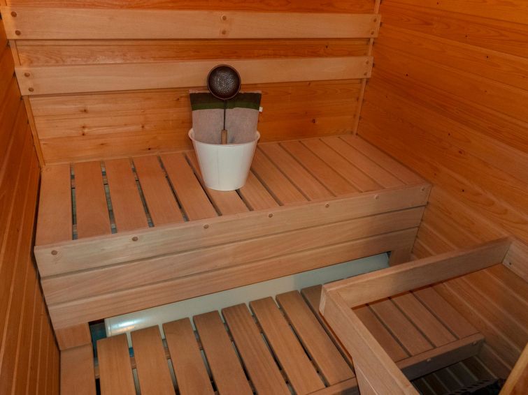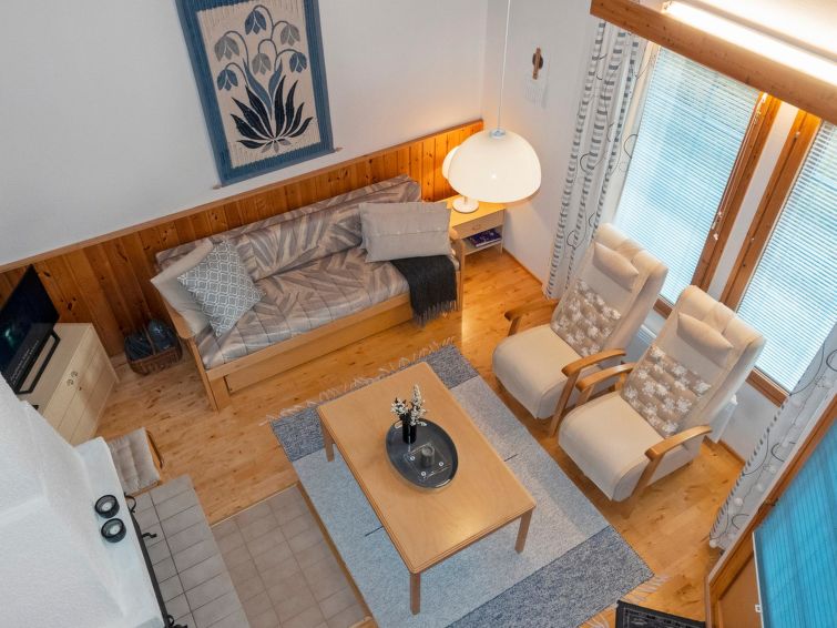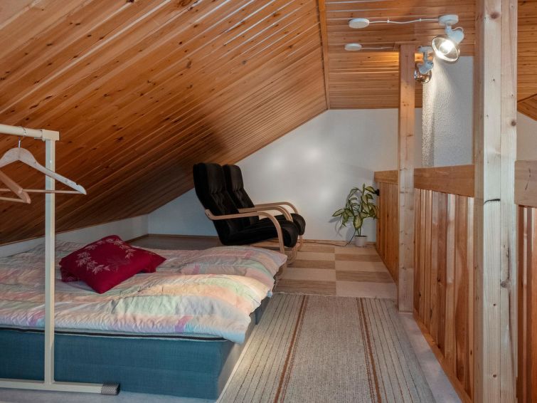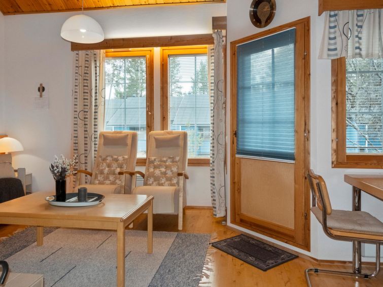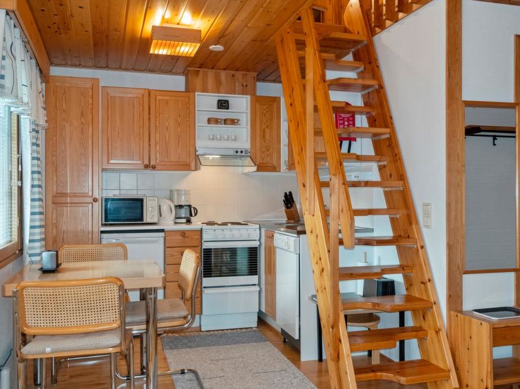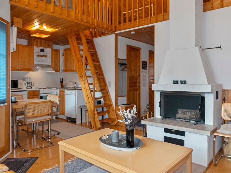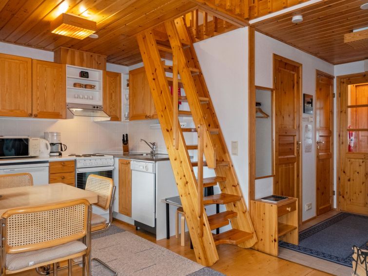 260 km to the north from Rovaniemi, in the tourist center of Saariselkä in Etelärinne area. Apartment in a row house, built in 1991, living room/kitchen, bedroom with 2 beds next to each other, 120 cm wide bed and 2 mattresses in the loft, sauna, washroom, separate WC and small terrace. Ground floor 38 m², loft 23 m².
