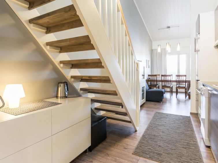 Apartment located in the Ukkohalla tourism centre, 4 + 2 persons, 61 m², built in 2013, living room, kitchen, two bedrooms, loft, sauna, shower room/toilet. Bedroom two beds, a sofa-bed in living room and two beds on the loft. Ukkohalla: Tourism centre located by Lake Syväjärvi, with an information centre, store, restaurant, spa, slope centre, snowmobile tracks, ski tracks, programme services, Cable Wakeboard, beach (further information at www.ukkohalla.fi). Distance to the Ukkohalla services 0.1 km. Kajaani airport 86 km, Oulu 170 km, Helsinki 650 km, bus stop Hyrynsalmi 18 km, railway station Kontiomäki 66 km.