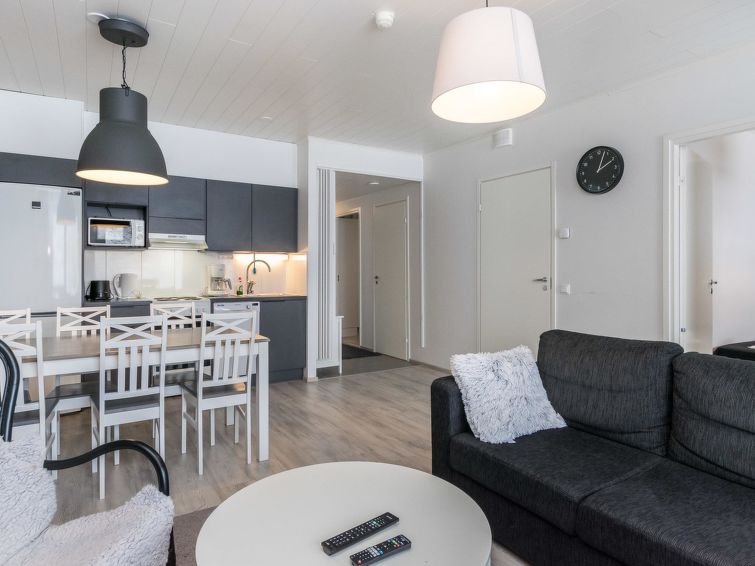 Apartment located in the Paljakka tourism centre, 6+2 persons, 69 m², built in 2015, living room, kitchen, 3 bedrooms, loft, sauna, shower room and toilet. Bedrooms two beds/room, a sofa-bed in living room.