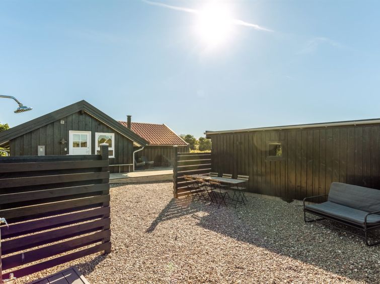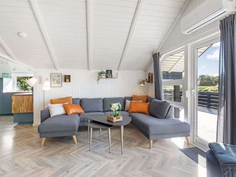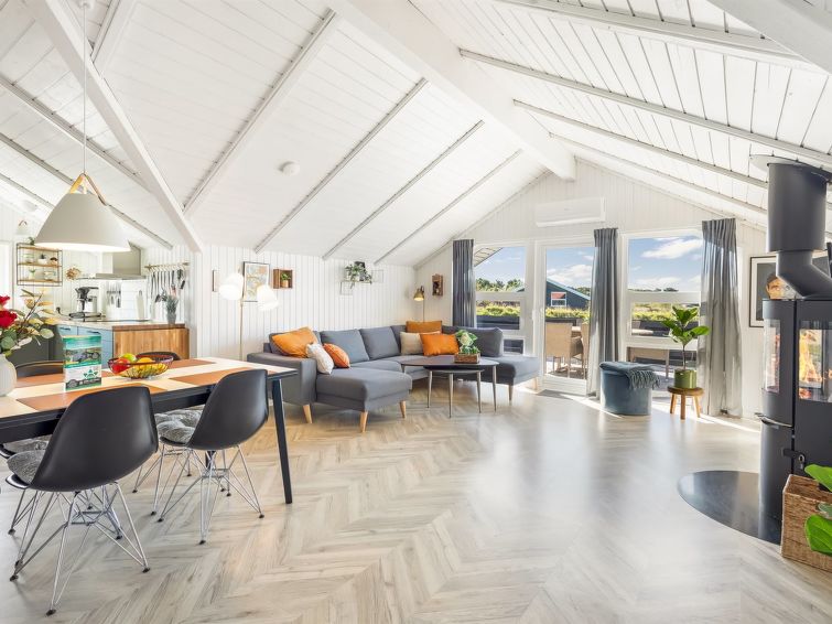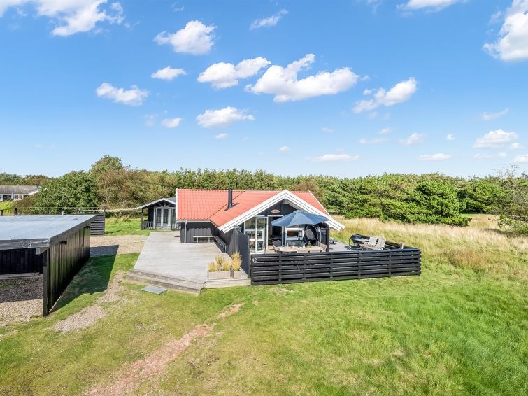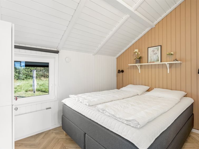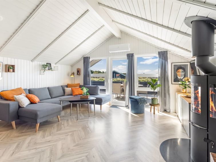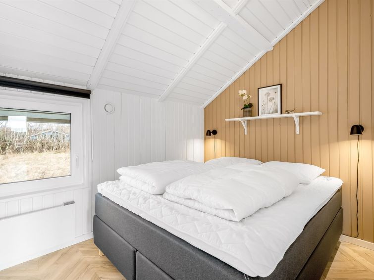 "Skyler" - 1km from the sea in Western Jutland", 4 rom hus 75 m2. Passer for 4 voksne + 3 barn. Stue med, TV. 1 rom med, 1 dobbeltseng. 1 rom med, 1 x 2 køysenger. Studio 1 rom med med, 1 dobbeltseng. Kjøkken (stekeovn, oppvaskmaskin, 4 induksjonskomfyr, frys). Dusj/WC. Terrasse 20 m2, dekt. Fasiliteter: høy barnestol barneseng (ekstra). Internett (trådløs LAN [WLAN]). Vennligst merk: røykfri bolig.