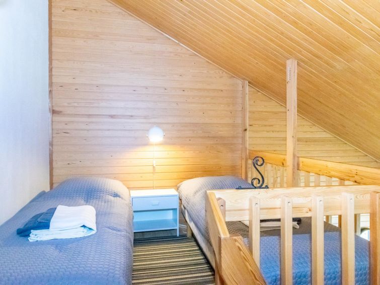 Sleeping areas: a bedroom in the loft with a 140 cm wide double bed and 2 separate beds in the open space of the loft. There are extra beds for two from the sofa bed downstairs. Steep stairs to loft.