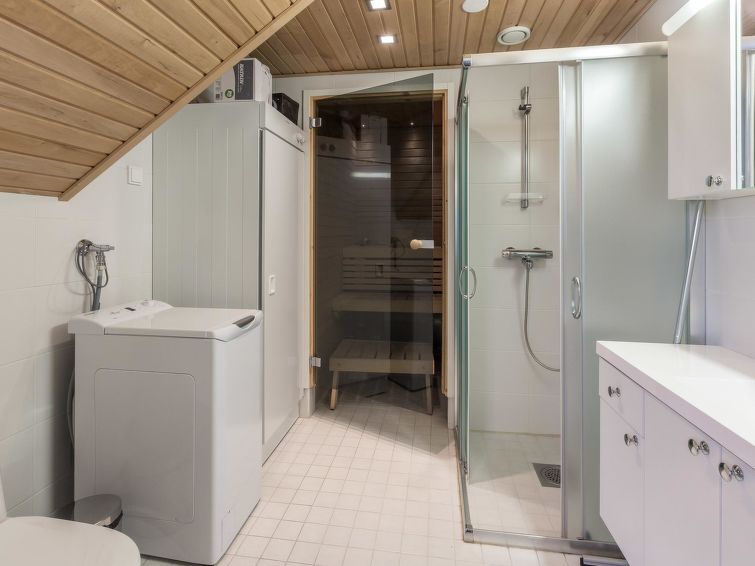 Apartment 2013, living room/ kitchen convertible sofa/ bed, bedroom double bed, upstairs 1 bedroom with 2 beds and own toilet, washroom, sauna (electric stove).