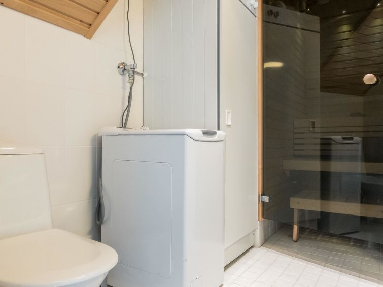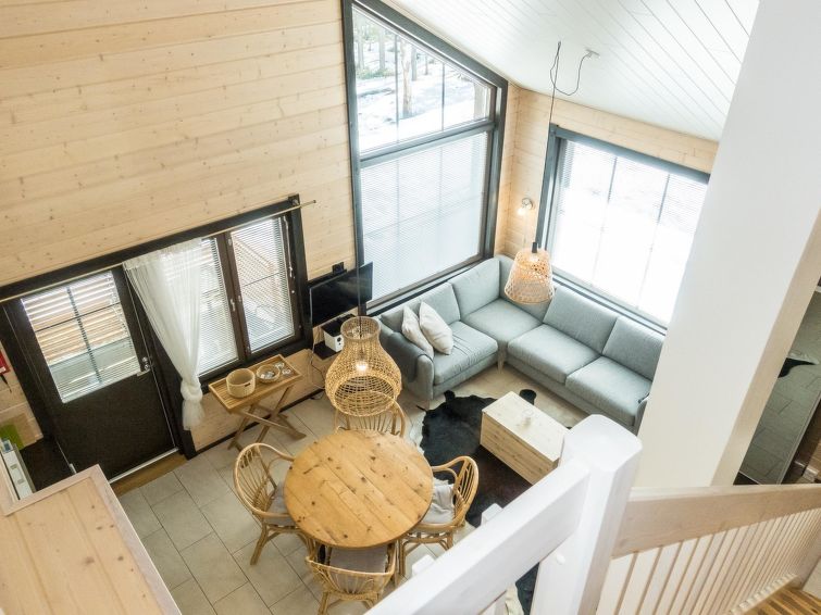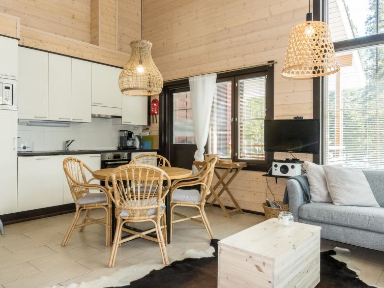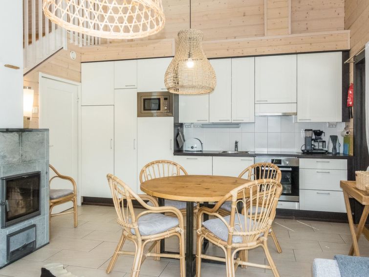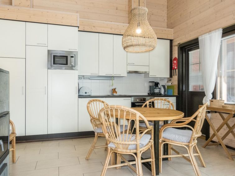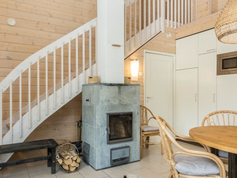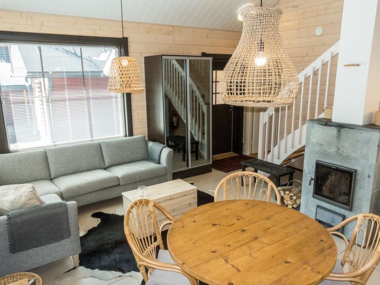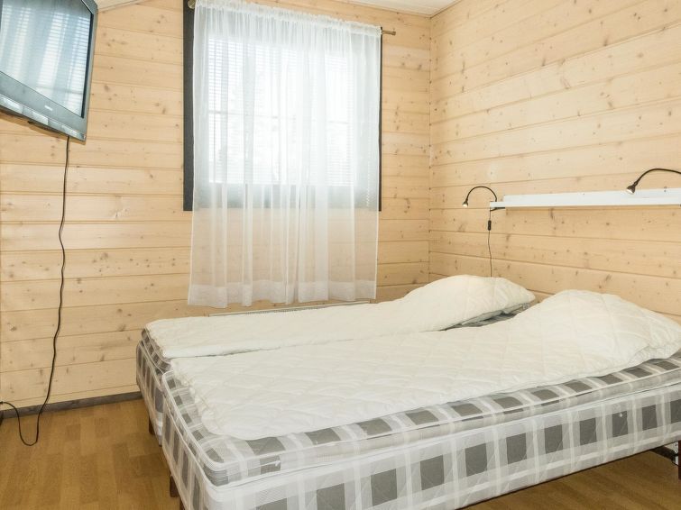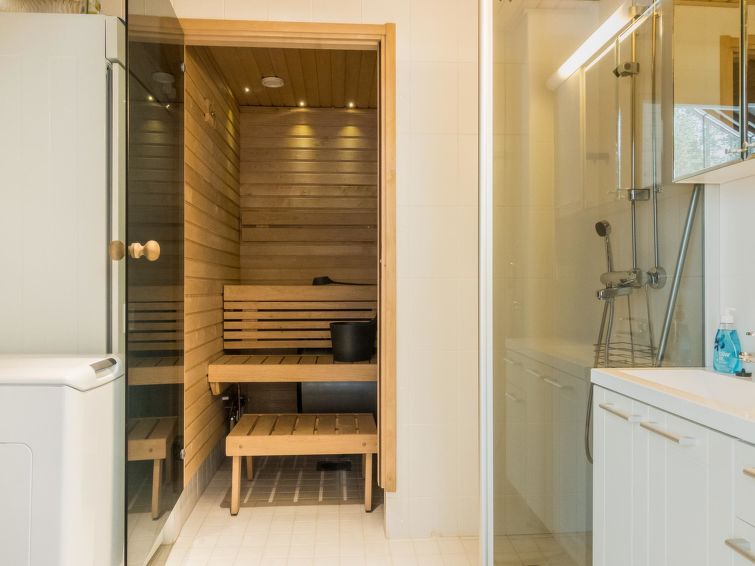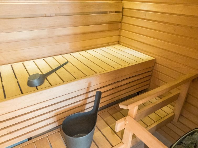 Apartment is built in 2012, living room/ kitchen, two bedrooms: downstairs bedroom with two beds, upstairs bedroom with 2 beds and own toilet. Washroom, sauna (electric stove) and toilet downstairs. In yard a storage with skimaintenance.