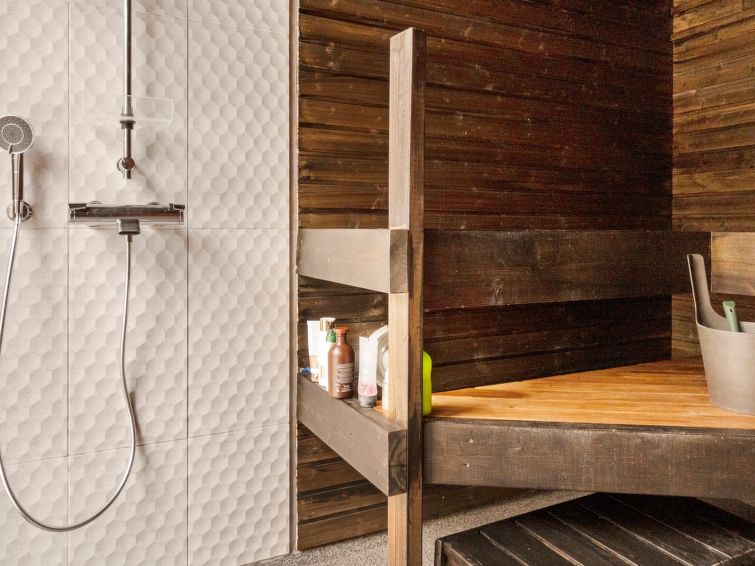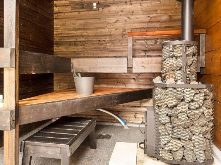 Large, partially covered terrace. Access to the separate sauna is via terrace. The sauna has wood-burning sauna stove and shower. Guest house in the sauna building. There are 140 cm bed, electric lightning and heating.