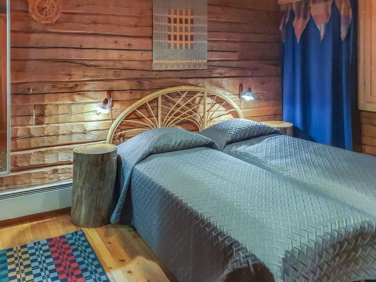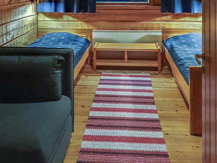 37 km north of Kuusamo, Ruka 9 km, Lake Alakitkajärvi 10 m, sandy bottom beach, pier, rowing boat and canoe. Log cottage, built in 1985, renovated 2013 and 2018, bedroom 1: 2 beds, bedroom 2: 2 beds + extra bed, bedroom 3: 2 bunk beds, bedroom 4: 2 beds, bedroom 5: single bed, bedroom 6: 2 beds and bedroom 7: double bed.