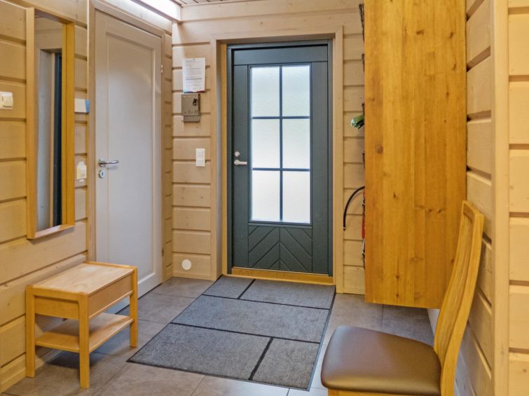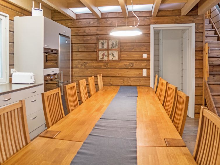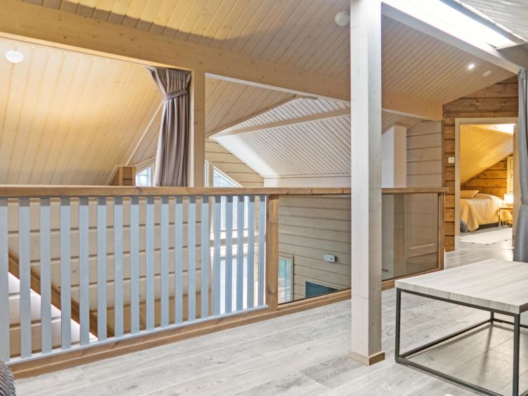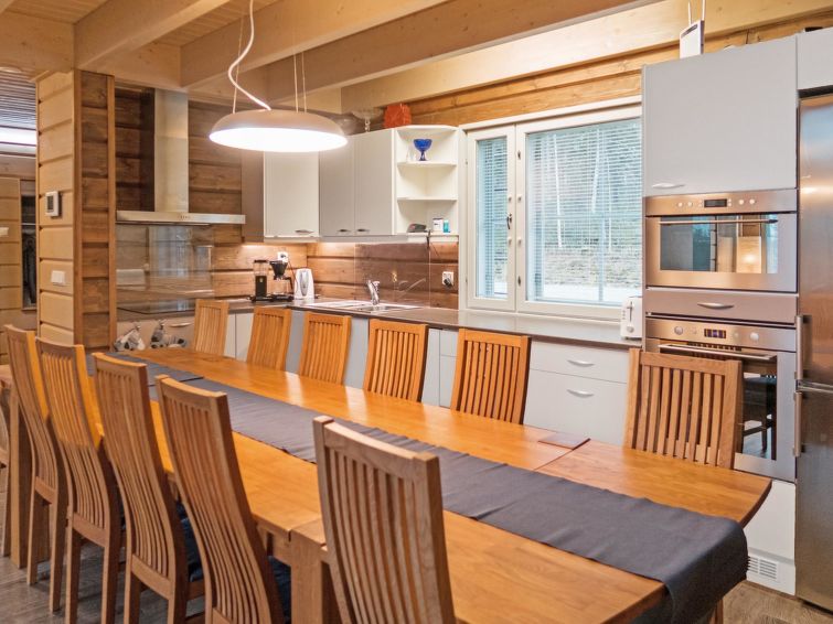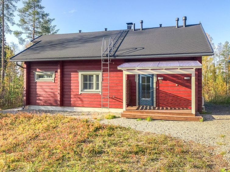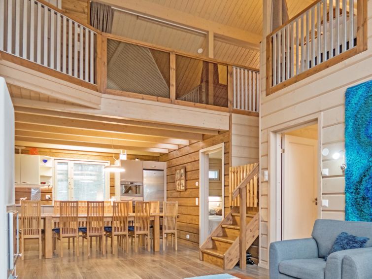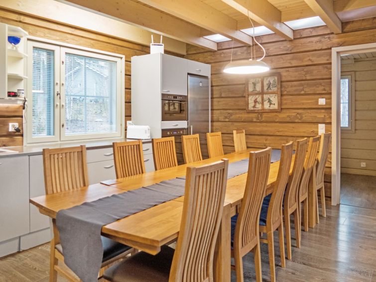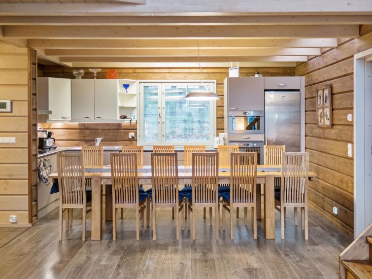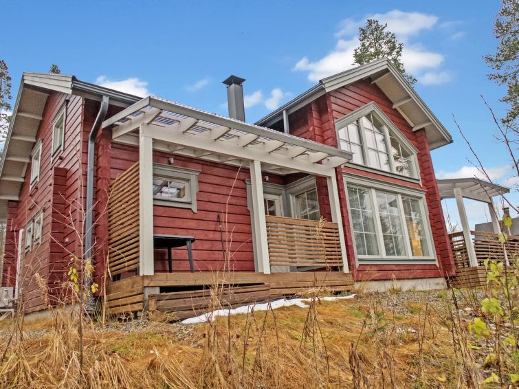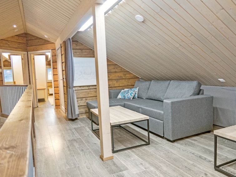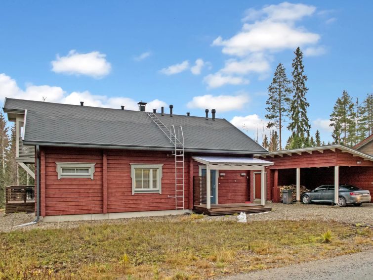This separate apartment in silent place in Vuokatti was completed in 2013. Living area 135m². The detached house, recently furnished with new furniture, has everything even a large group needs for a relaxing holiday: a spacious, unified living room and kitchen, a sauna (always ready electric heater), a large washroom with two showers and a whirlpool tub, and in addition to the four bedrooms, there are two sleeping areas separated by curtains in the upper hall. The cottage has two terraces: a refreshing terrace next to the dressing room and a larger terrace next to the living room, where you can find a dining group and a gas grill.
