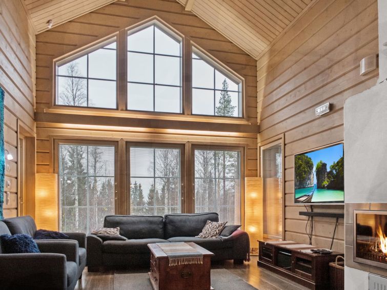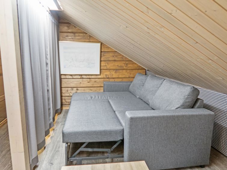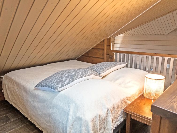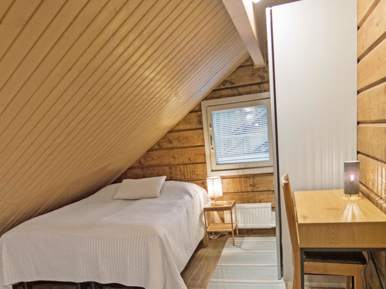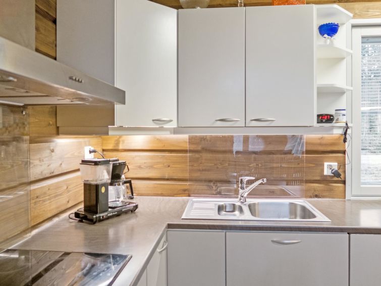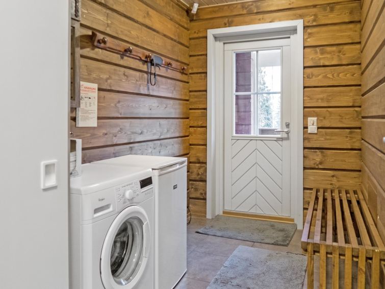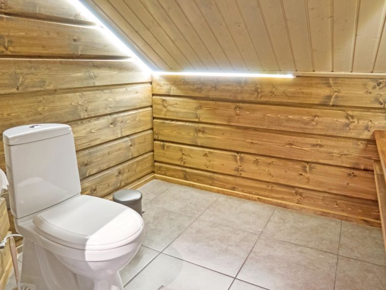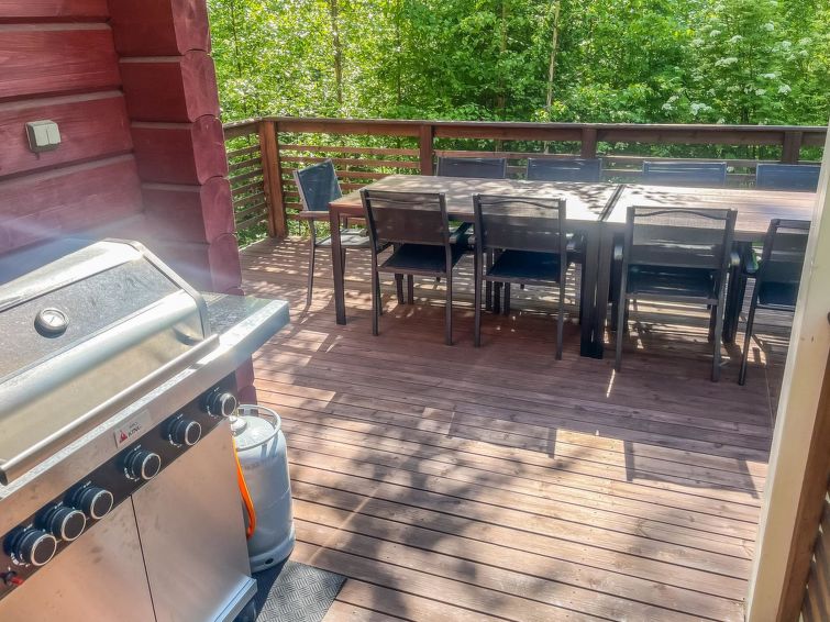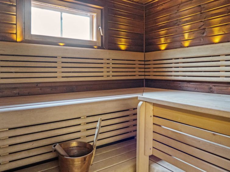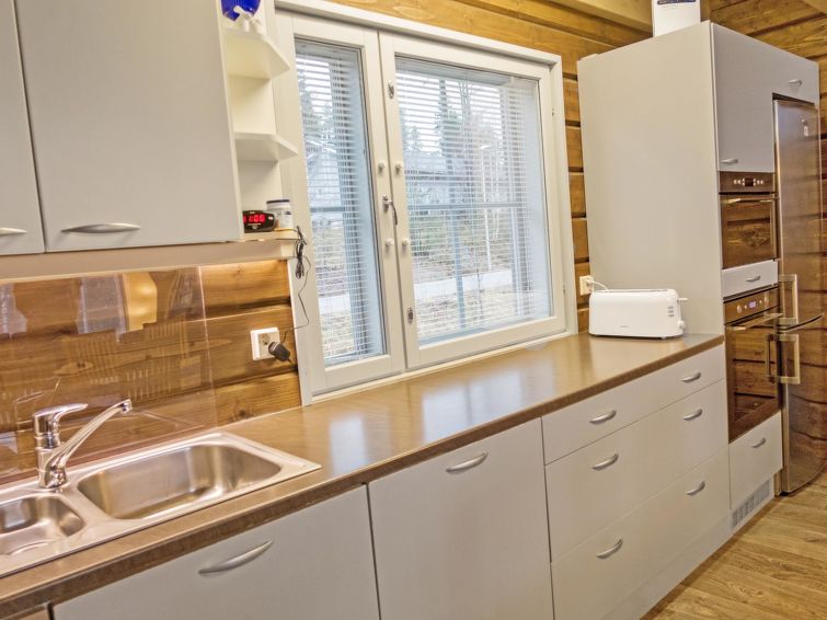 This separate apartment in silent place in Vuokatti was completed in 2013. Living area 135m². The detached house, recently furnished with new furniture, has everything even a large group needs for a relaxing holiday: a spacious, unified living room and kitchen, a sauna (always ready electric heater), a large washroom with two showers and a whirlpool tub, and in addition to the four bedrooms, there are two sleeping areas separated by curtains in the upper hall. The cottage has two terraces: a refreshing terrace next to the dressing room and a larger terrace next to the living room, where you can find a dining group and a gas grill.