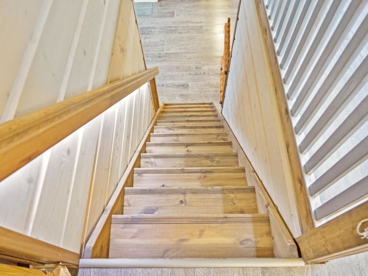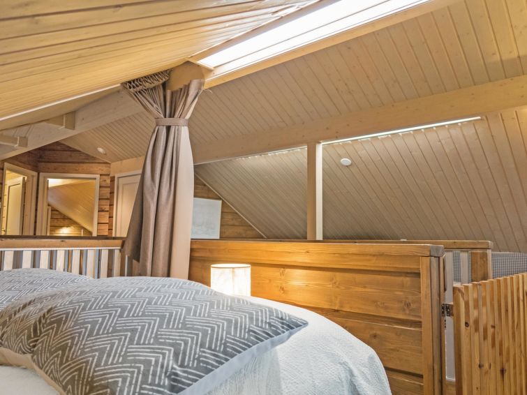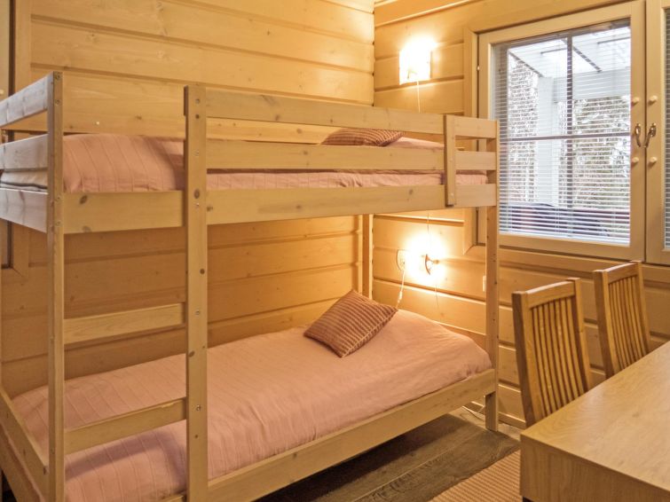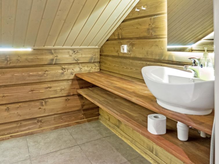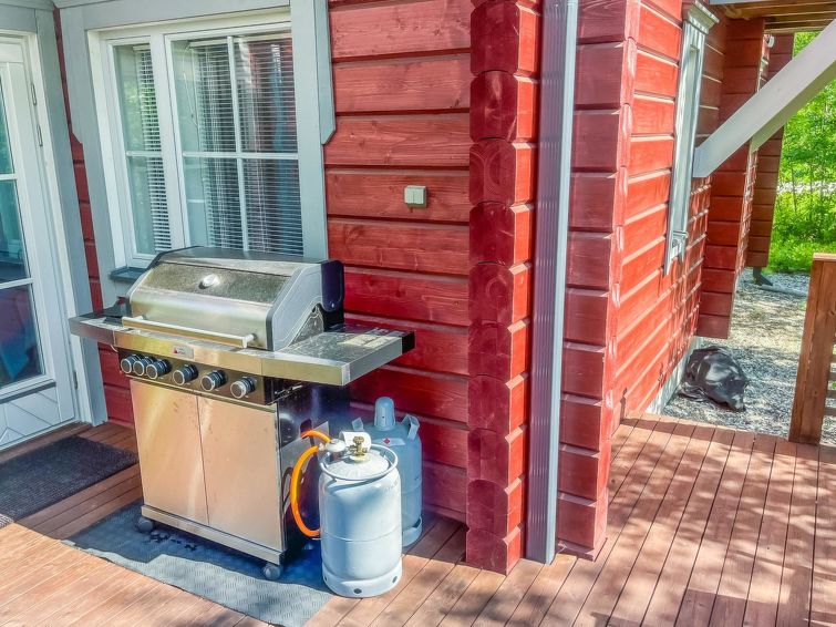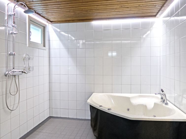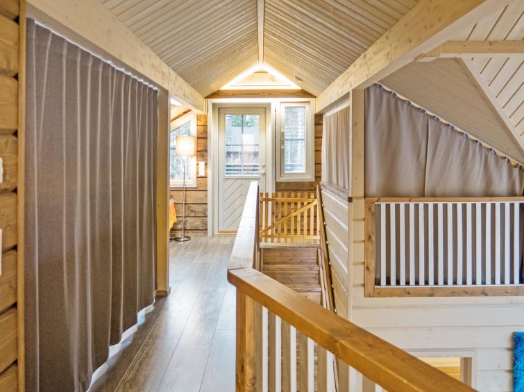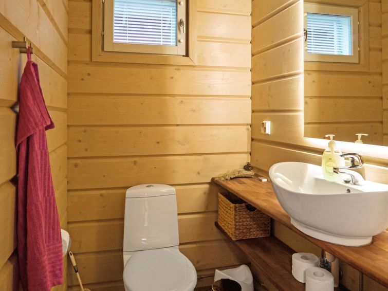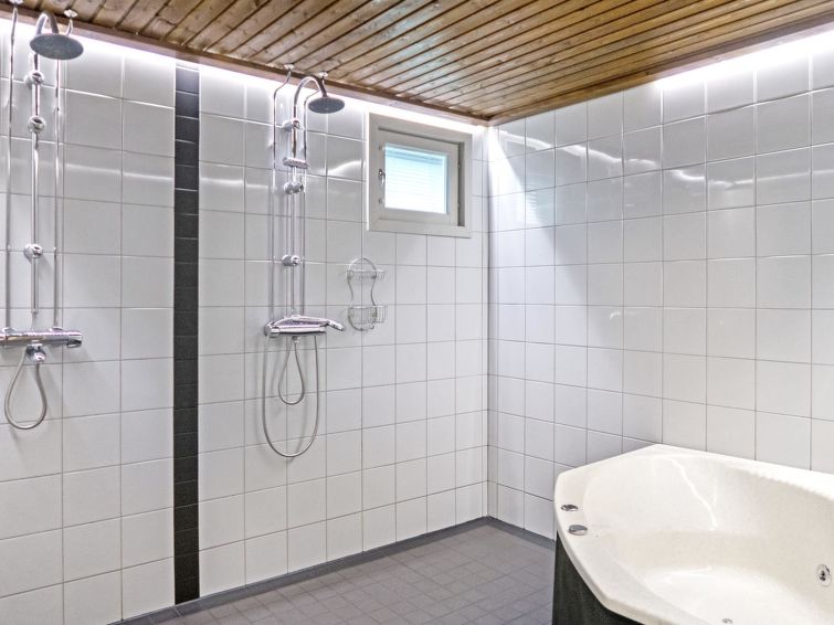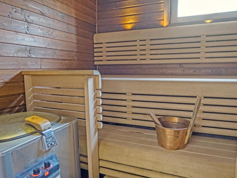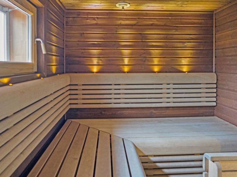 This separate apartment in silent place in Vuokatti was completed in 2013. Living area 135m². The detached house, recently furnished with new furniture, has everything even a large group needs for a relaxing holiday: a spacious, unified living room and kitchen, a sauna (always ready electric heater), a large washroom with two showers and a whirlpool tub, and in addition to the four bedrooms, there are two sleeping areas separated by curtains in the upper hall. The cottage has two terraces: a refreshing terrace next to the dressing room and a larger terrace next to the living room, where you can find a dining group and a gas grill.