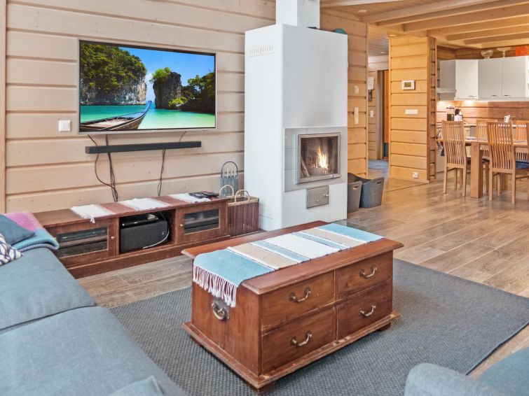 In addition to modern and high-quality appliances, the well-equipped and spacious kitchen has a wide range of dishes and a large dining table that can be expanded for up to 14 diners if necessary. A bright living room with a fireplace, a 58" smart TV and bluetooth soundbar, and a view of nature from the large windows invite you to spend relaxing quality time together!