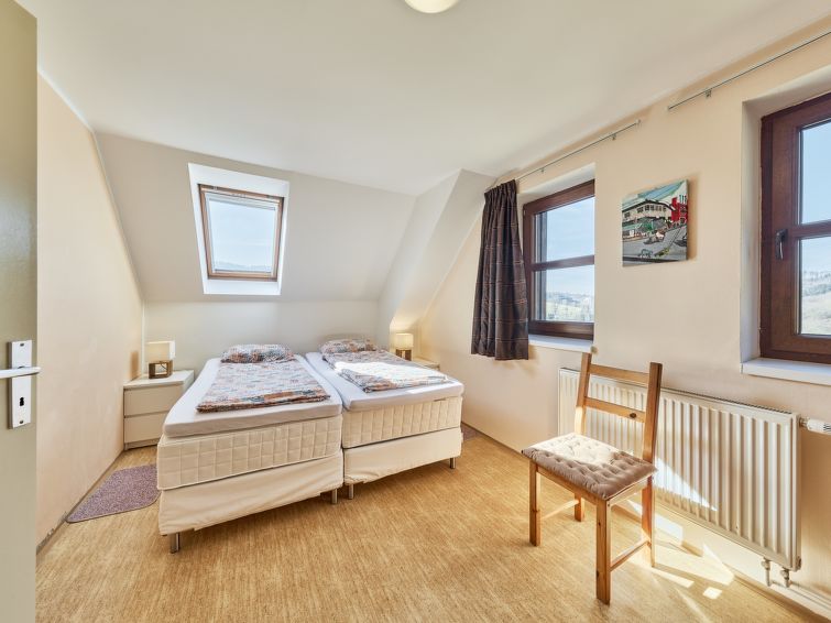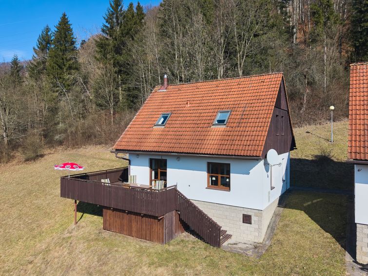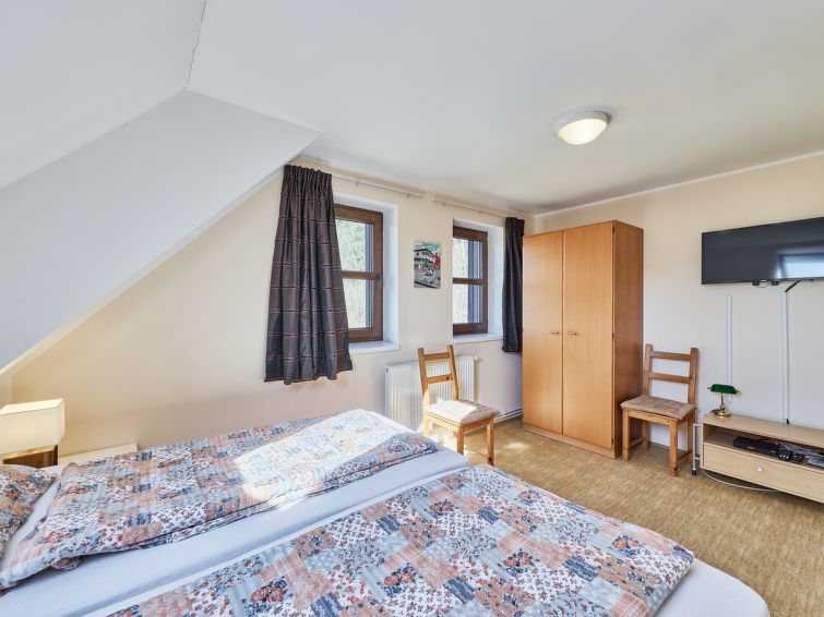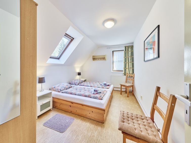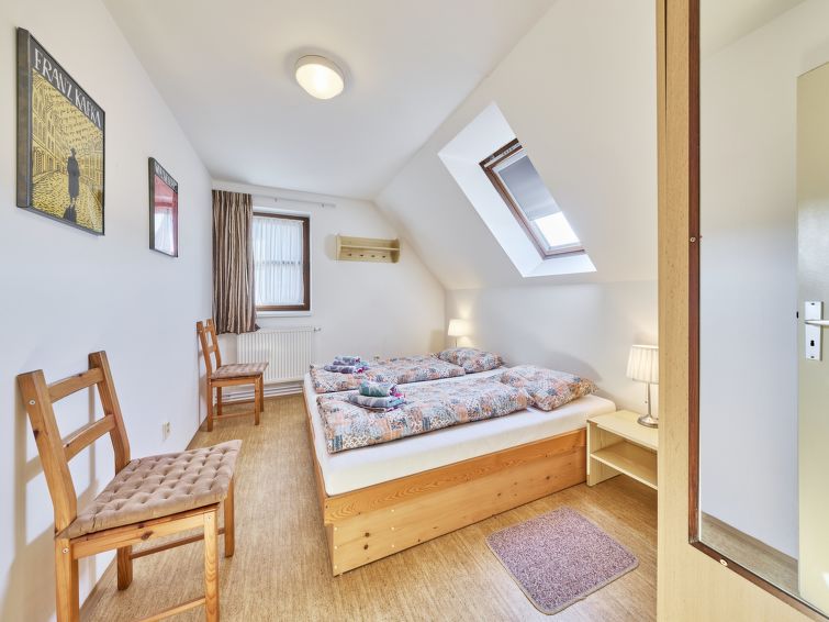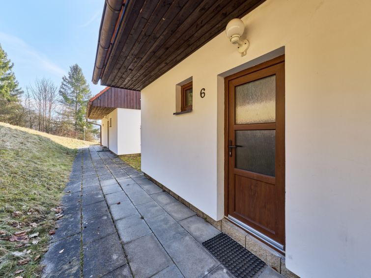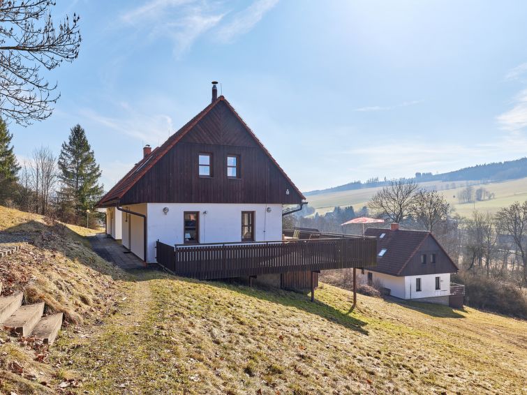 Stárkov 18 km fra Náchod: Resort "Stárkov", 450 m.o.h. Frittstående, bygget i 1997, renovert i 2015, omgitt av enger. 22 hus i resorten. I utkanten, i en solrikt, høyt posisjon ved en høyde, direkte ved skogskanten, 24 km fra innsjø 10 km fra skiområdet, i det grønne. Fellesbruk: tomt 10 ha, eng, dam, 1 badebasseng (8 x 4 m, dybde 150 cm dyp, Sesongåpent: 15.Jun. - 16.Sep.). Bordtennis, volleyball, badminton, volleyball bane, sandvolleyball, sitteplass, grill, grillplass, lekeplass (rutsjebane, huske, sandkasse). I anlegget: resepsjon, oppholdsrom, bistro, massasje (ekstra). Biljard, lekerom, fotballsbord, trikkpolinje, kiosk, sykkelrom, vaskeri (ekstra), sykkelutleie. Sengetøyskift (ytterlige ekstra). Håndkleskift (ytterlige ekstra). Romrengjøring på forespørsel (ekstra). Rundstykkeservice muligt etter avtale. Innkjøpsservis mulig før ankomst. 200 m lang bratt, smal Tilgang med bil hele veien. Parkering (for 2 biler) ved hbrukt. Daglivarehandel 1 km, supermarked 8 km, restaurant 1 km, café 10 m, bussholdeplass "Stárkov, mlékárna" 50 m, togstasjon "Hronov" 8 km, innendørs pool 18 km. Golfbane(9 hull) 26 km, seileskole 26 km, tennis 500 m, minigolf, rideskole, turstier fra hbrukt, sykkelvei 10 m, skiheis 6 km, skiskole 17 km, langrensløype 100 m, skøytebane 8 km, lekeplass 10 m. Attraksjoner i nærheten: Adršpašsko-teplické skály 15 km, Náchod 17 km, Broumovské stěny 17 km, Ratibořice a Babiččino údolí 22 km, Broumov 24 km, Relaxpark Pec pod Sněžkou 50 km. Velkjente skiområder: Radvanice 10 km, Petříkovice 17 km, Mladé Buky 36 km. Velkjente innsjøer: vodní nádrž Rozkoš 26 km. Vennligst merk: velegnet for barnefamilier, babyutstyr på forespørsel (inkl.).