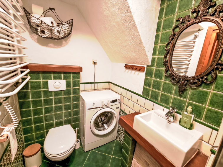 4 rom hus 90 m2. Åpen stue 25 m2 med, 2 dobble sovesoffaer (120 cm, lengde 200 cm), åpen peis, satelit-TV, DVD og air-conditioning. Utgang til hagen, til terrassen. 1 litet rom 9 m2 med, 1 dobbeltseng (140 cm, lengde 200 cm), TV. 1 rom 14 m2 med 2 senger (90 cm lengde 200 cm), 1 dobbel sovesoffa (120 cm, lengde 200 cm), TV. 1 rom 12 m2 med, 1 sovesoffa (90 cm, lengde 200 cm), 1 dobbeltseng (140 cm, lengde 200 cm), TV. Åpent kjøkken (oppvaskmaskin, 4 keramiske kokeplater, mikrobølgeovn, frys). 2 dusjer/WC. El-oppvarming, vedoppvarming solenergioppvarming. Terrasse 10 m2, dekt. Terrassemøbler, lager. Fasiliteter: høy barnestol barneseng for barn opp til 3 år, ved (gratis). Internett (trådløs LAN [WLAN], gratis). Parkeringsplass ved hbrukt.