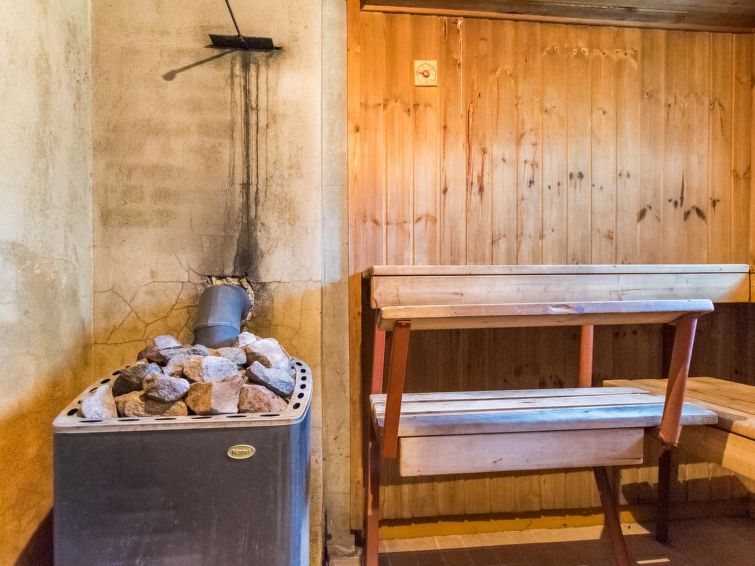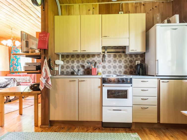 Wooden cottage 1983, living room/kitchen extra bed for 2, 2 bedrooms each with 2 beds, washroom and sauna renovated 2023, open porch. Traditional cottage on level grassy plot. There are two other same owner's cottages next to this cottage. Between cottages there are some trees.