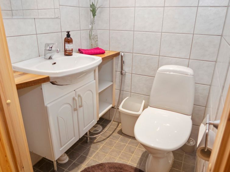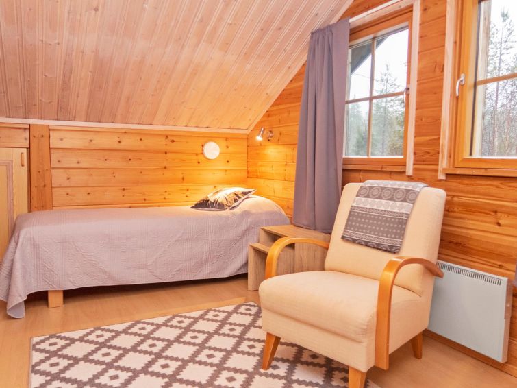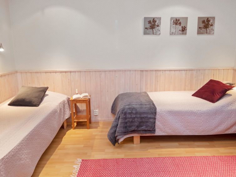 Log cottage built in 2008, bedrooms 1-2 (downstairs): 2 beds in each, bedroom 3 (upstairs): 2 beds, bedroom 4 (upstairs): double bed + 1 bed. 1 extra bed. Downstairs + upstairs = 85 m², upstairs with sloping ceilings. Combined kitchen/living room, electric sauna, separate toilet and another toilet in the washroom.