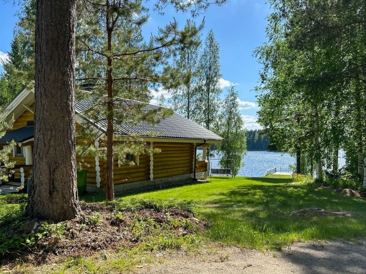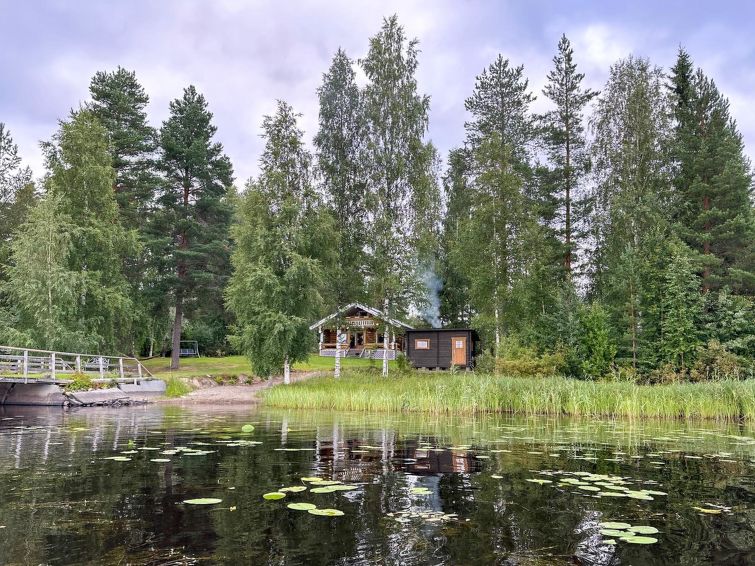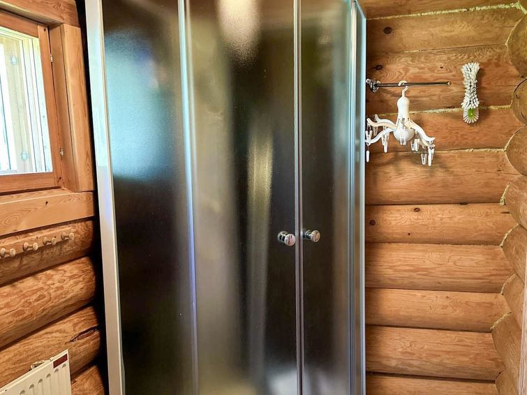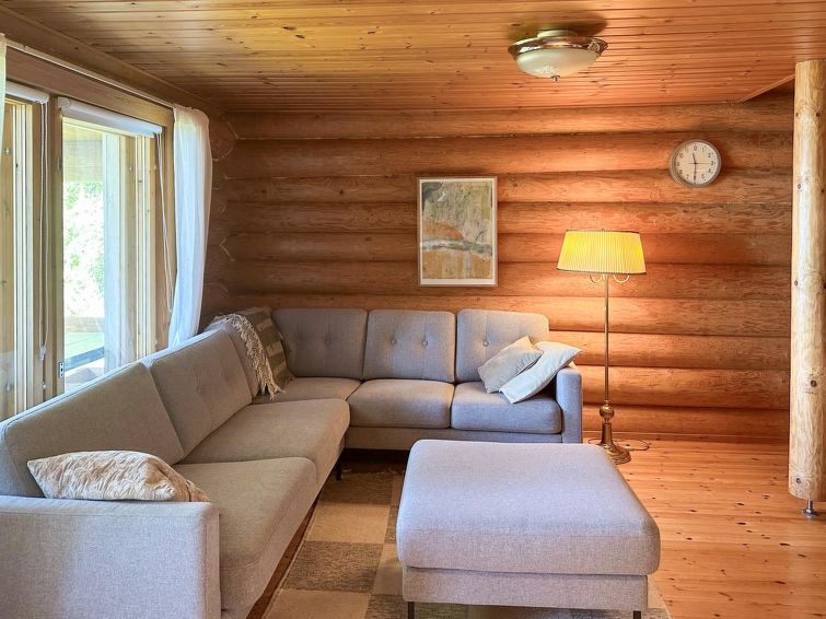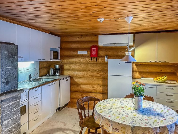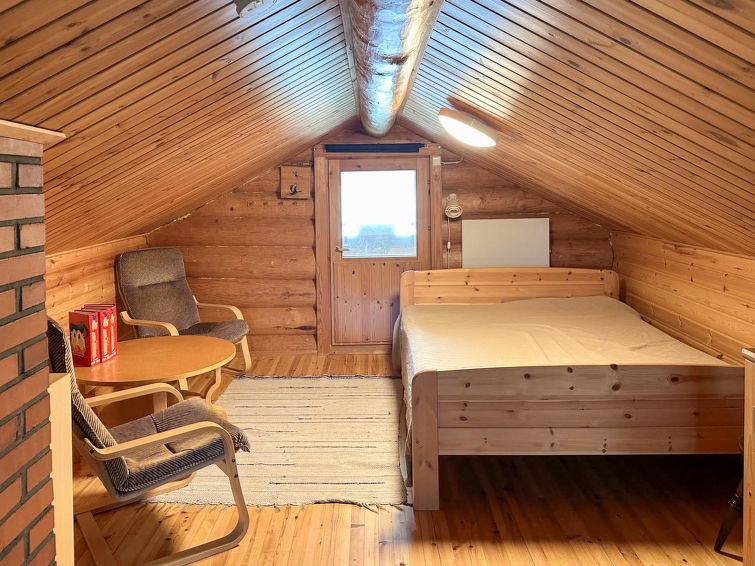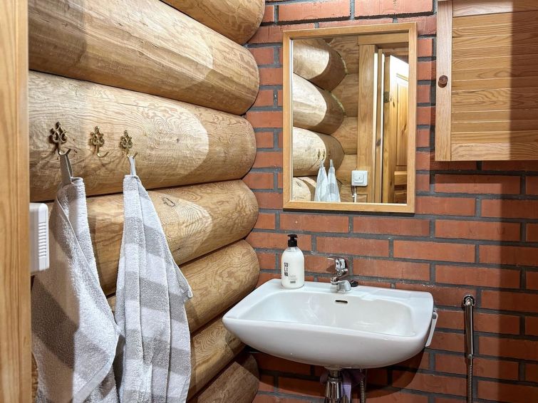 Log villa built in 1990, renovated in 2016 - 2017, kitchen-living room, hallway, bedroom with double bed, shower room, sauna (wood stove), upstairs loft with 3 beds, sofa bed, spacious balcony. Air source heat pump, with cooling and heating functions.