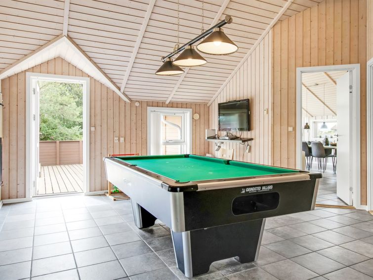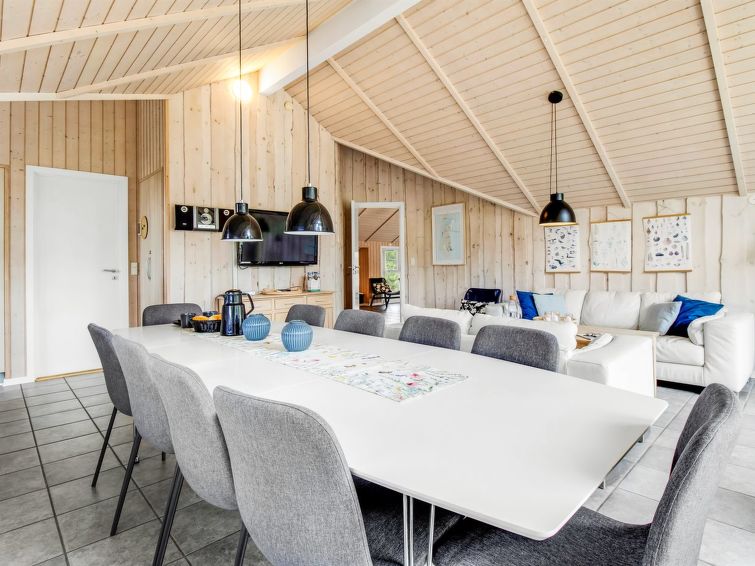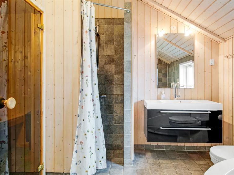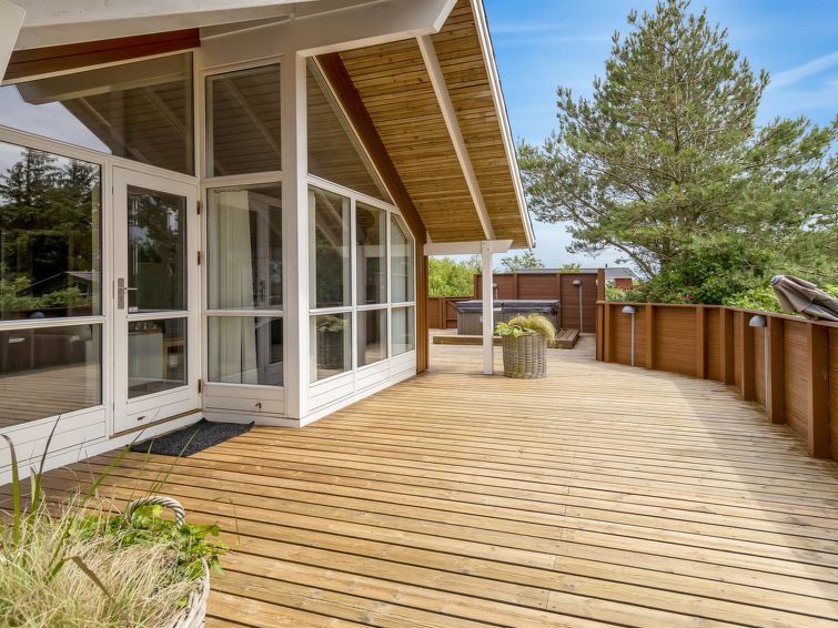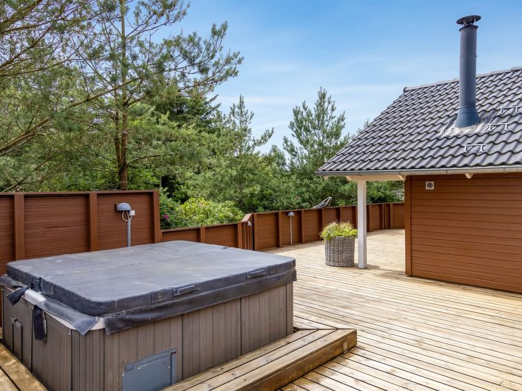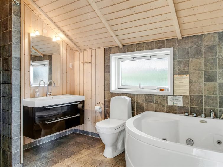 "Svenny" - 800m from the sea in Western Jutland", 4 rom hus 122 m2. Passer for 7 voksne + 2 barn. Stue med, TV og stereoanlegg. 1 rom med 1 seng og 1 x 2 køysenger. 1 rom med, 1 dobbeltseng. 1 rom med, 1 dobbeltseng. Kjøkken (stekeovn, oppvaskmaskin, 4 keramiske kokeplater, mikrobølgeovn, frys). Dusj/WC, boblebad. Terrasse 6 m2, dekt. Fasiliteter: høy barnestol. Internett (trådløs LAN [WLAN]). Vennligst merk: røykfri bolig.