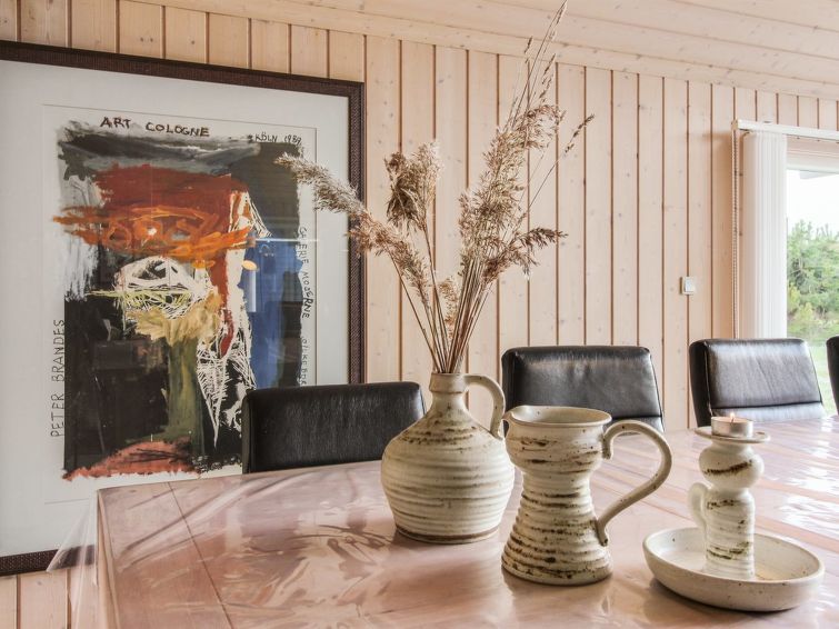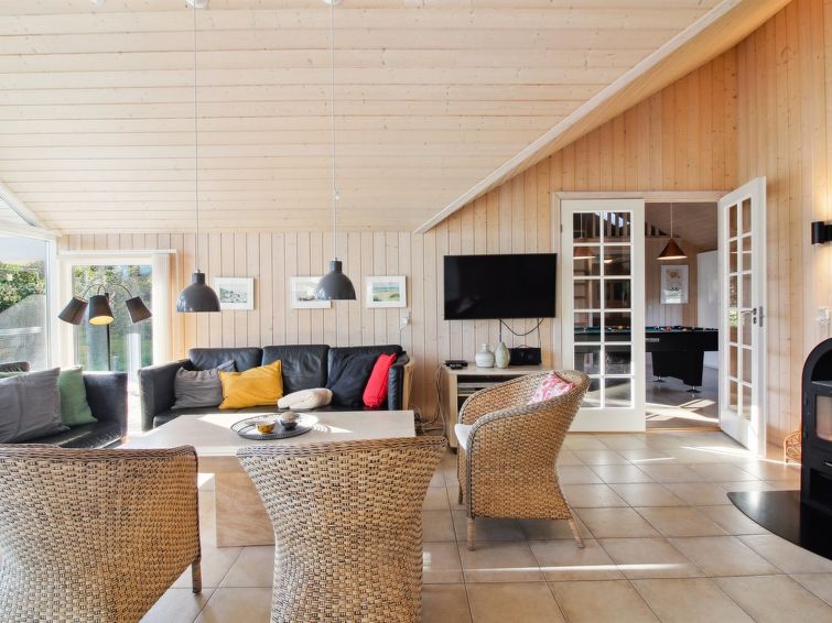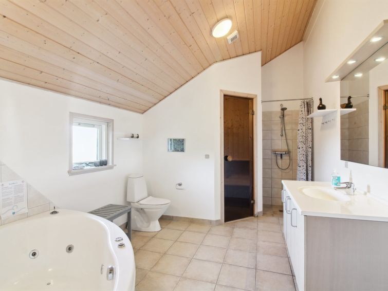 "Synnöve" - 550m from the sea in NW Jutland", 4 rom hus 151 m2. Passer for 10 voksne + 1 barn. Stue med, TV. 1 rom med, 1 dobbeltseng. 1 rom med, 1 dobbeltseng. 1 rom med 2 senger. Åpen galleri, 1 rom med 2 senger og 2 sovemuligheter. Kjøkken (stekeovn, oppvaskmaskin, 4 keramiske kokeplater, mikrobølgeovn, frys). 2 dusjer/WC, boblebad. Fasiliteter: høy barnestol barneseng (ekstra). Internett (trådløs LAN [WLAN]). Vennligst merk: røykfri bolig.