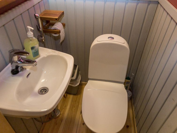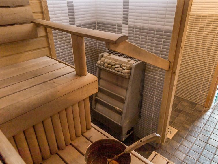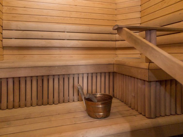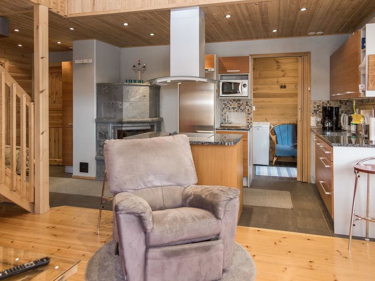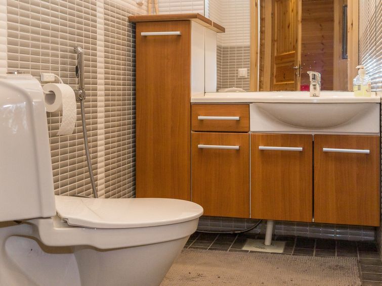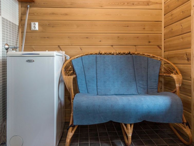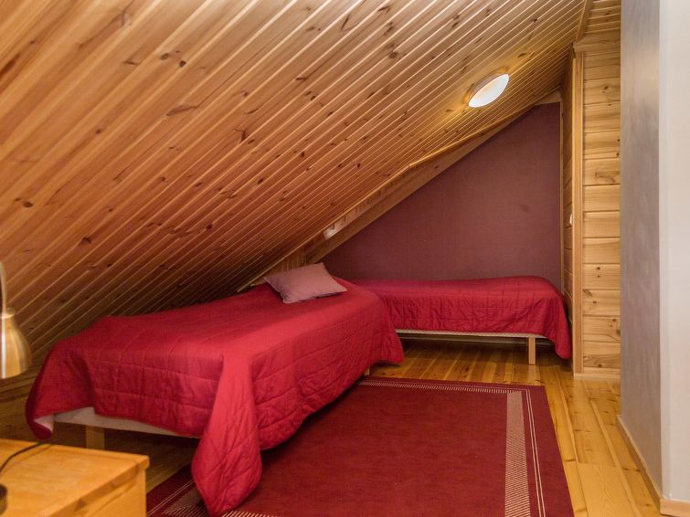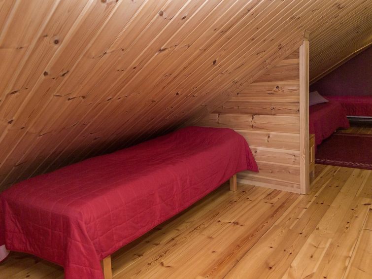 Log house 2006, kitchen-lving room, bed room double bed, upstairs bed room double bed, WC and loft three beds. Washing room, dressing room, WC, sauna (electric stove), terrace. Gas grill, 2 TV:s. Basement is not in use. Air source heat pump. Neat and high-quality Syvärinkulta B holiday apartment, which is situated in a peaceful cottage area, the nearest separate neighbouring cottages being 20-30 metres away. Path to shore is rather steep, with stone steps along the way. Good “base camp” at Tahko resort for a family or two couples.