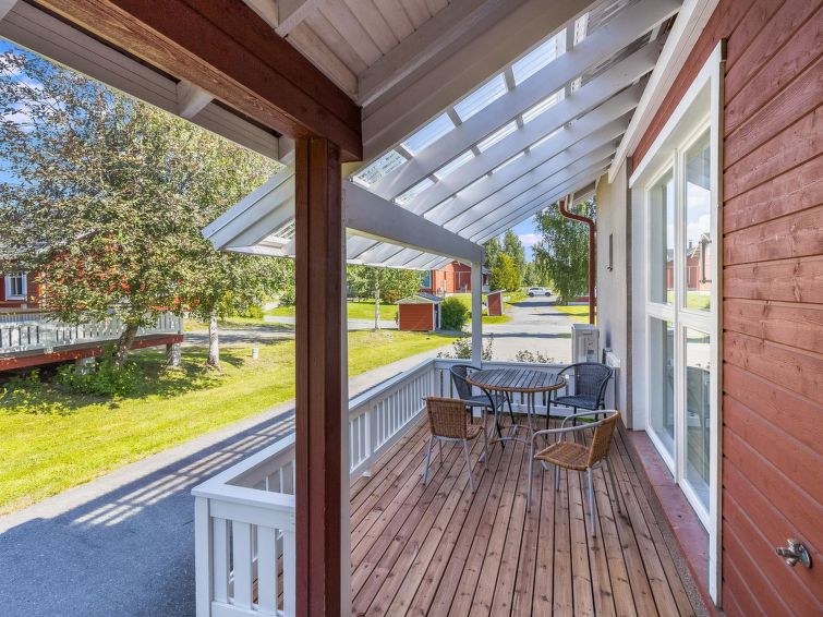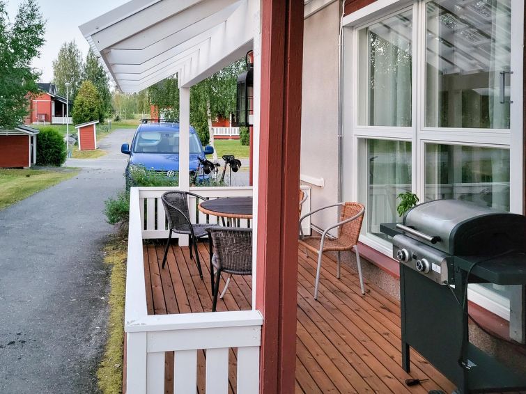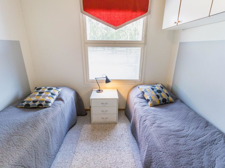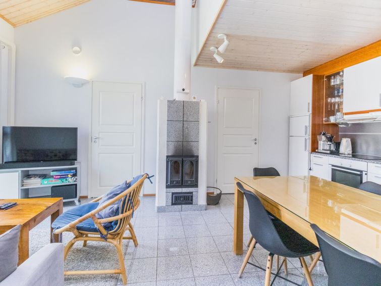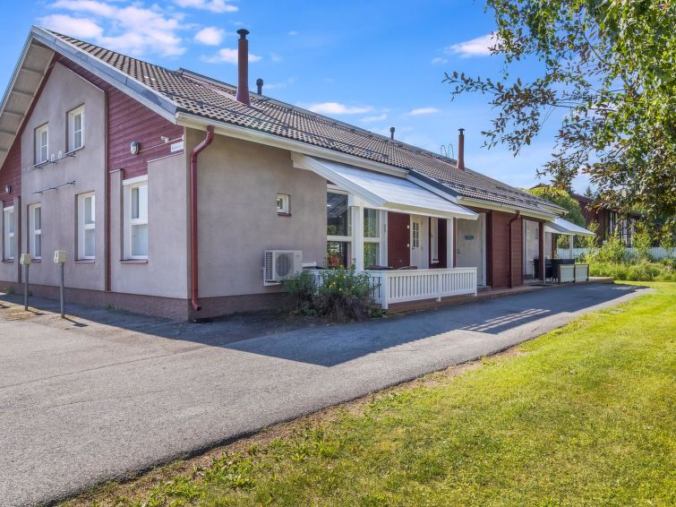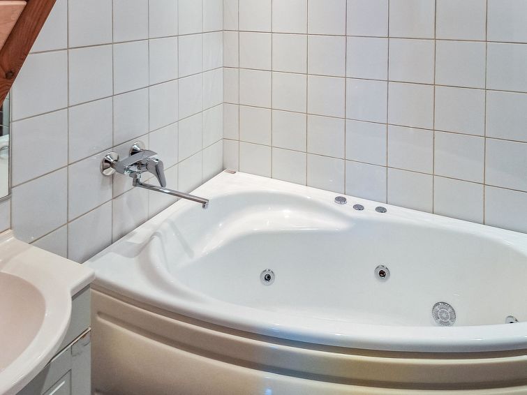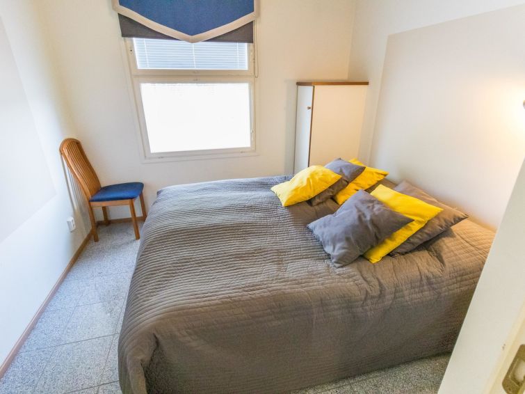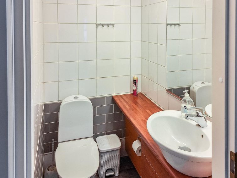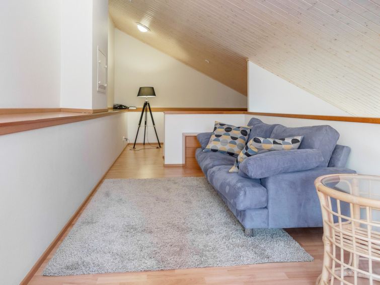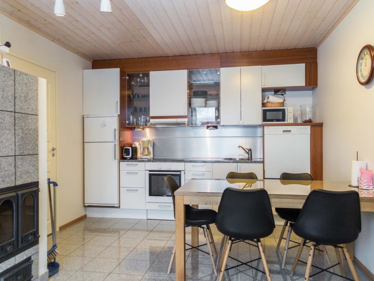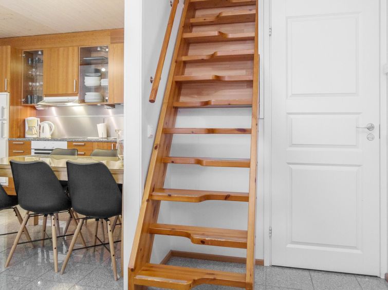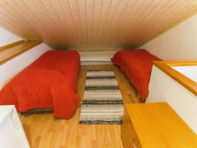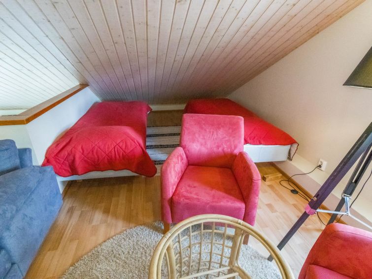 One half of semi-detached house unit at Tahko Ski Resort built 2004. In downstairs 2 bedrooms 2 beds in each, living room/kitchen, washroom with jacuzzi, sauna (electric stove), toilet and open porch. On sleeping loft are 4 separate beds, loft ceiling height is “standing height” only; no direct view from loft to downstairs, steep stairs to loft. High standard, neat holiday Tahko Ski Koivulantie apartment located in a convenient place close to all Tahko services.