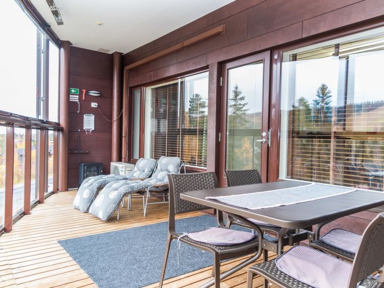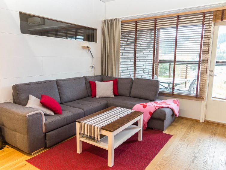 Apartment has own sauna with electric stove of the ‘ever-ready’ type, washing room with shower and WC. The fireplace in the apartment in not in use. Holiday apartment is located in heart of Tahko on the second apartment floor of the Tahko Spa Suite’s “Orange house”. Tahko Spa 100 m. View from Tahko Spa Junior Suite Orange A6 apartment living room, sauna, bed room and glazed balcony to ski slopes. The holiday apartment has a wireless Wlan connection.