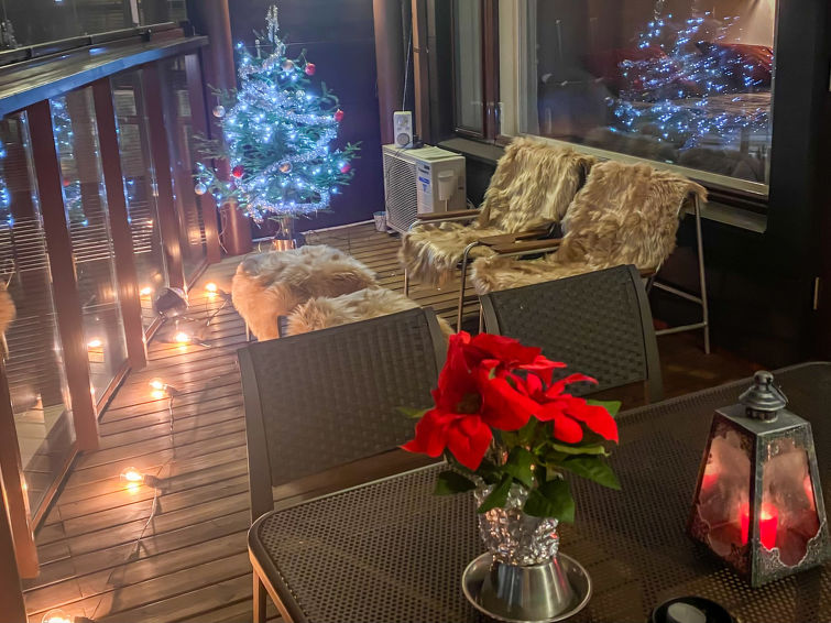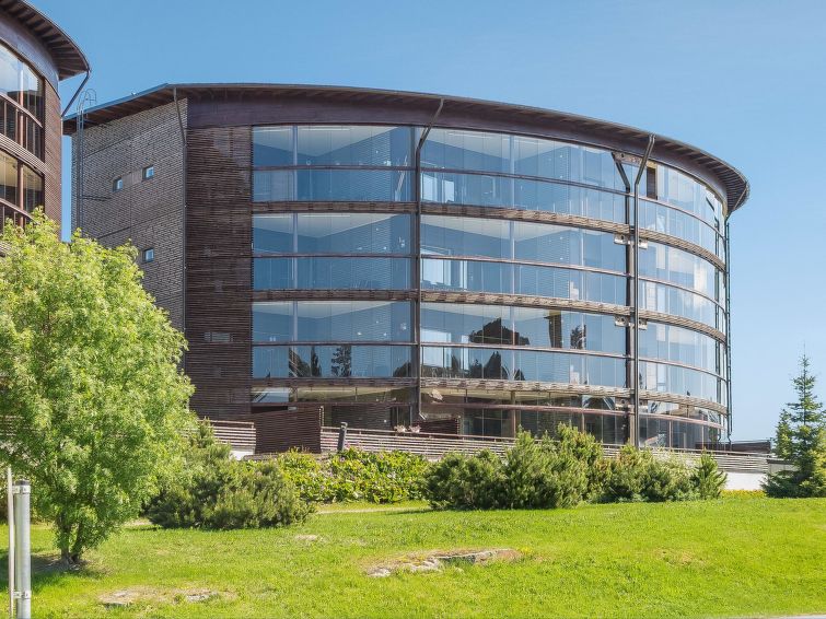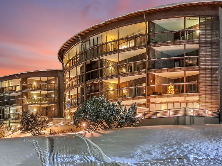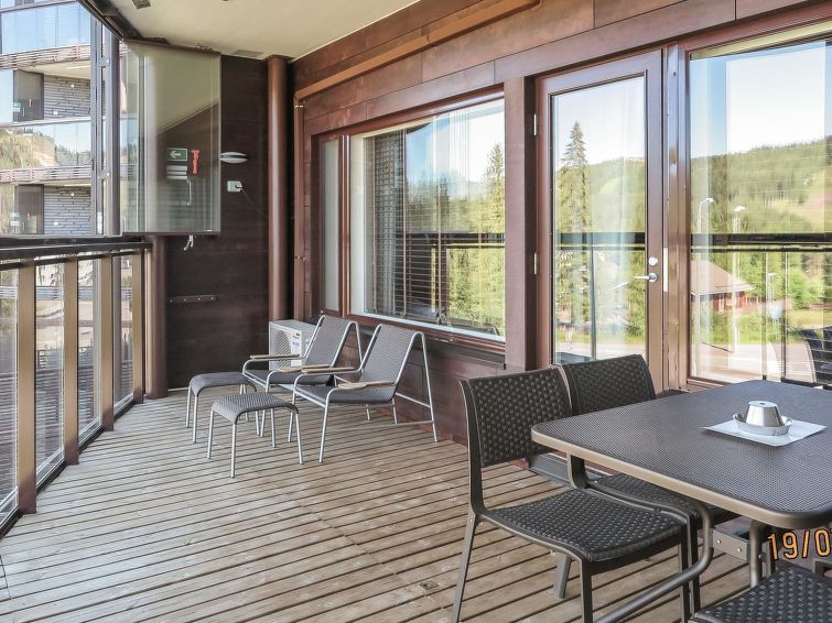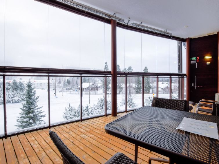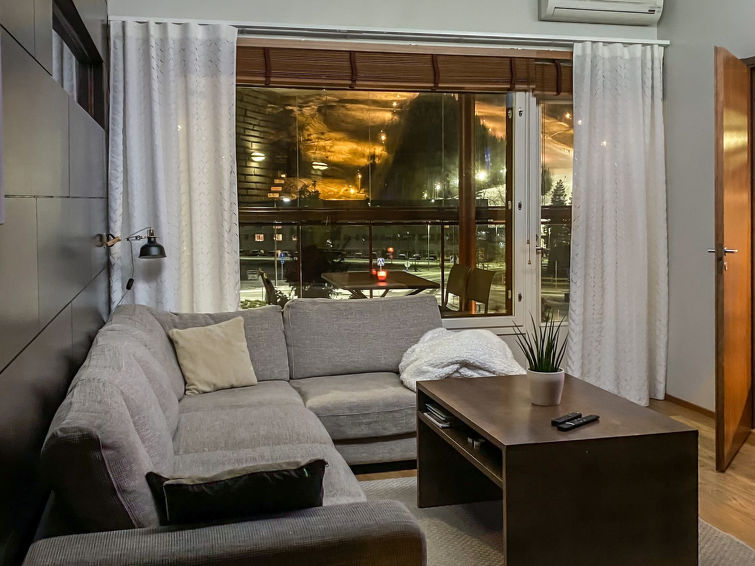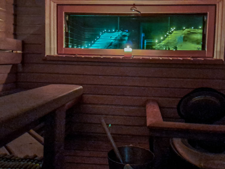 Apartment has own sauna with electric stove of the ‘ever-ready’ type, washing room with shower and WC. 1 set of firewood is included in price; more firewood can be purchased from the local shops. Final cleaning, bed linen and bathrobes are included in the price. Holiday apartment is located in heart of Tahko on the second apartment floor of the Tahko Spa Suite’s “Orange house”. Tahko Spa 100 m. View from Tahko Spa Junior Suite Orange B6 apartment living room, sauna, bed room and glazed balcony to ski slopes.