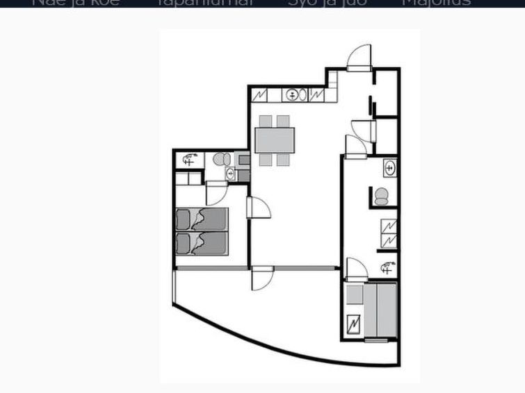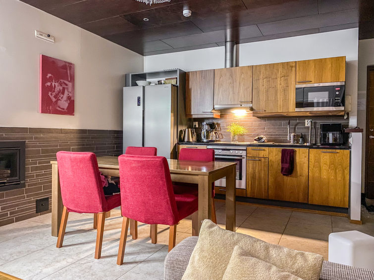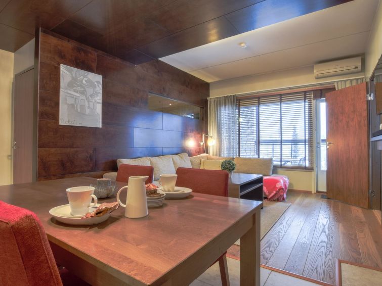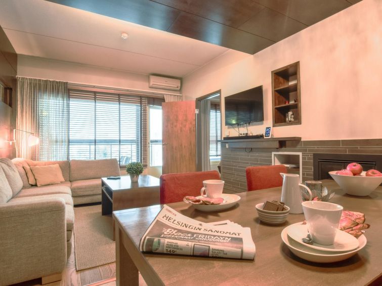 High standard Tahko Spa Junior Suite Orange B6 apartment located in heart of Tahko Ski Resort, built 2006, surface area 59 m² and 18 m² glazed terrace. Apartment has comfortable living room with open plan kitchen. In the living room sofa bed 2 extra beds. Bedroom with 2 separate beds, bedroom has a small shower and WC.