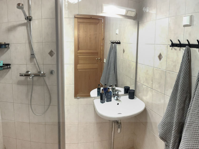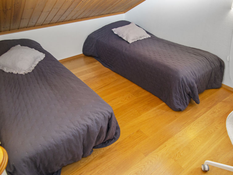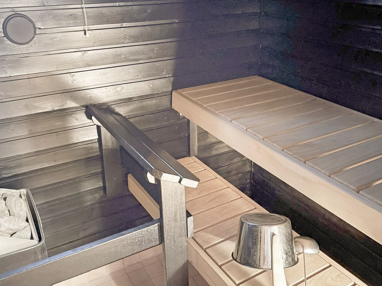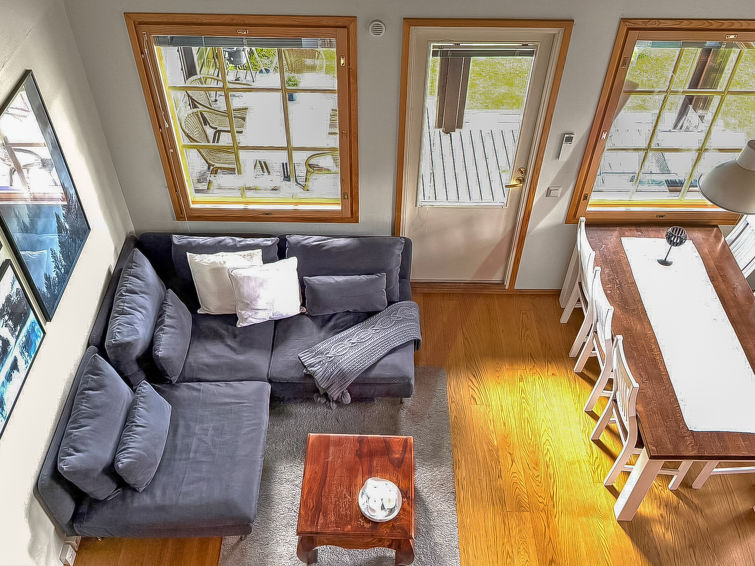 In this semi-detached apartment you have downstairs a living room/kitchen, a bedroom with 2 beds, a washroom, a separate toilet, sauna (electric stove), a hall and a terrace.