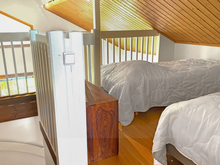 The loft has a bedroom with 2 beds and 2 extra beds in the lobby lof the loft. There is an air source heat pump with cooling and warming functionality on the cabin.