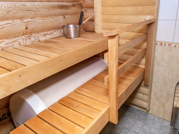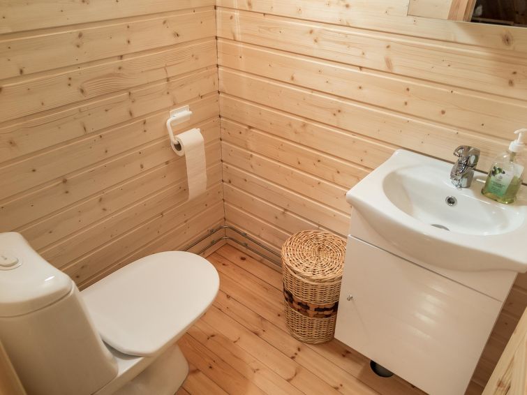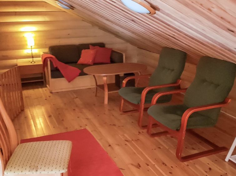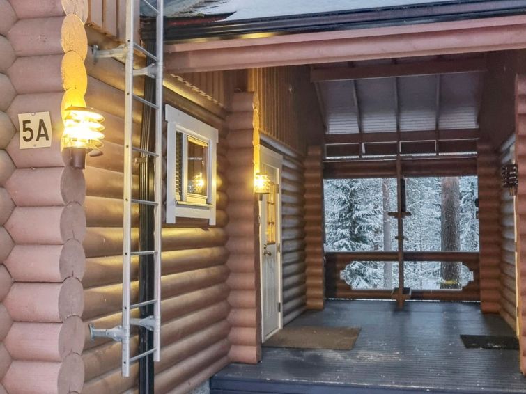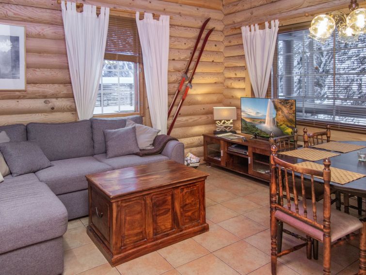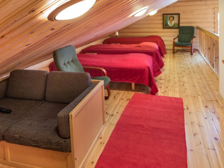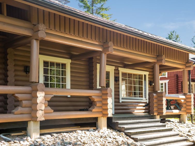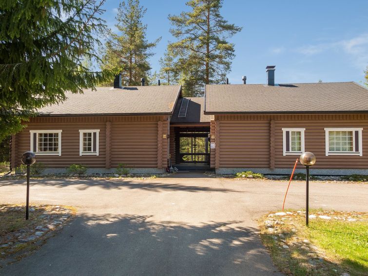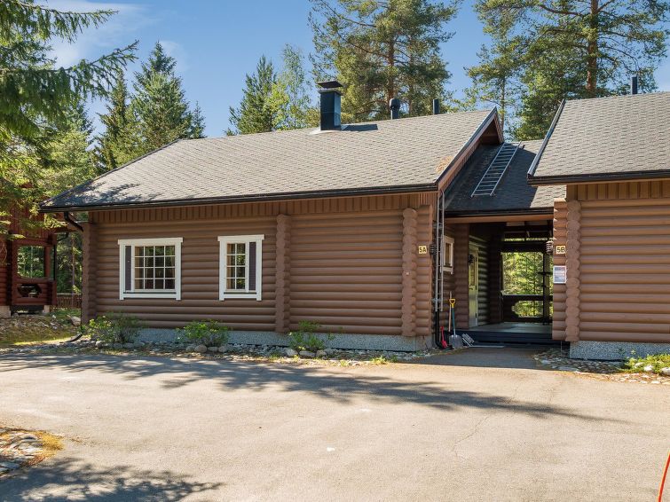 Log semidetached house at the heart of the ski center Tahkovuori, built in 2003, kitchen/living room, bedroom with double bed, bedroom one bed (120 cm wide), washing room, sauna (electric stove), upstairs small bedroom 2 beds, open loft 3 beds, upstairs also WC, open porch. Hovimäenraitti holiday apartment with a peaceful location, however all services are nearby; Restaurant Ukko 1,2 km, the Sokos Hotel Tahkovuori / restaurant Piazza / shop 1,6 km, skilift 1,6 km, ski track 100 m, Tahko Spa 1,4 km, Golf Courses 1,1 km (Old Course), and 7,5 km (New Course). 65 km northeast of Kuopio, Lake Syväri 200 m, a public beach 3 km, shallow, hard sand bottom, no boat.