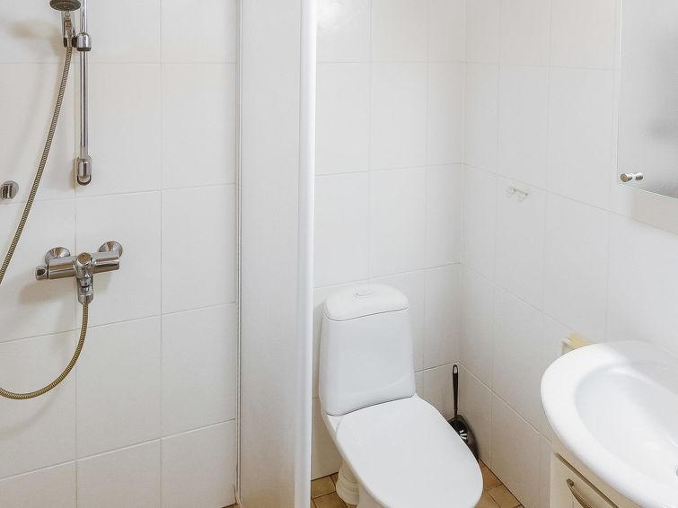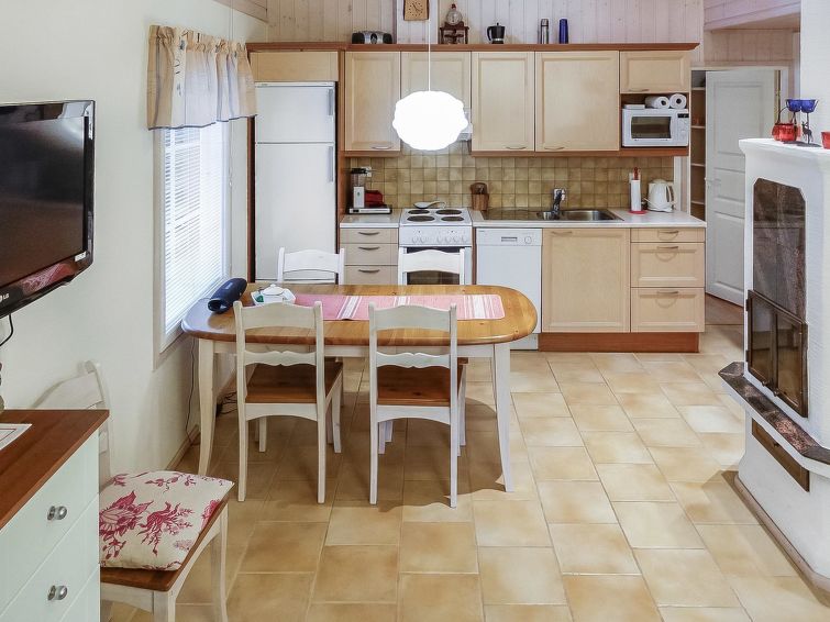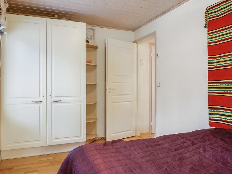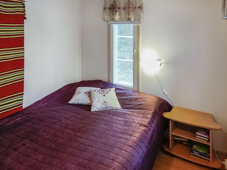 Living room/kitchen with sofa bed, bedroom with double bed (can be separated to single beds), 2 beds in the loft, steep stairs to the loft, sauna, washroom/WC and small storage.