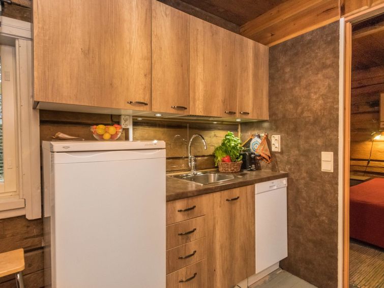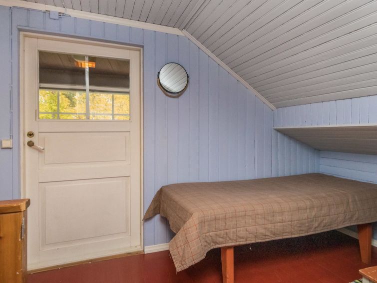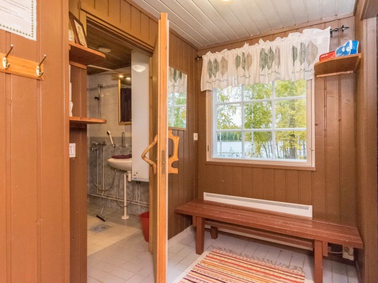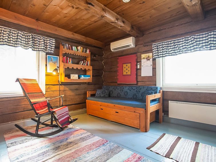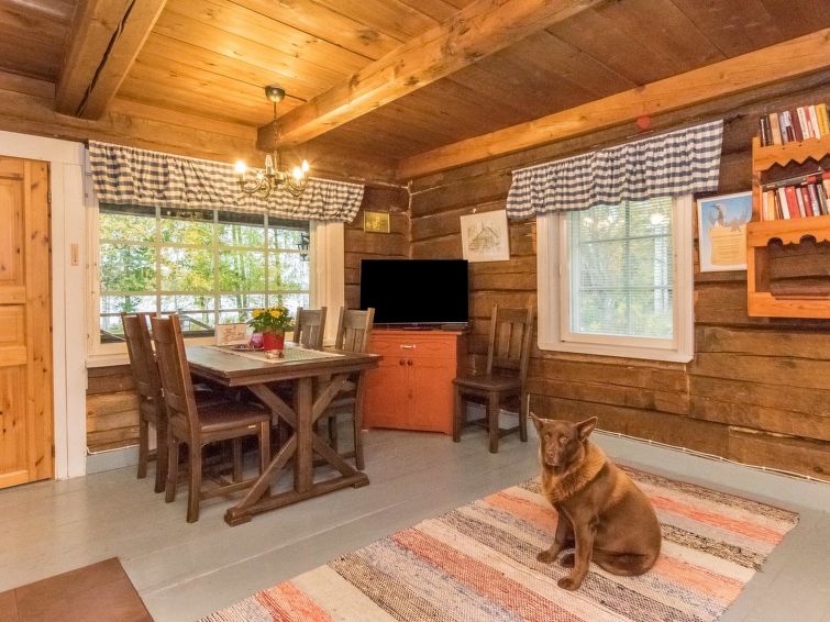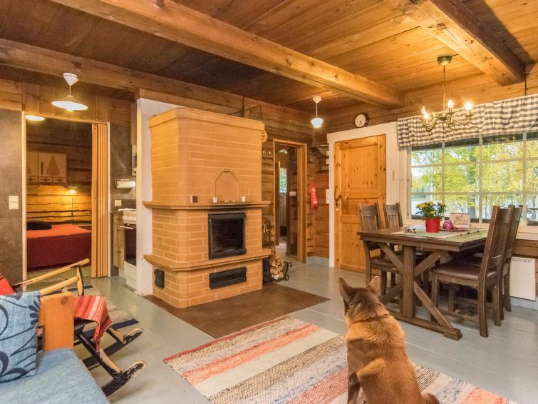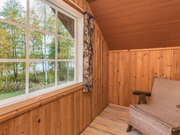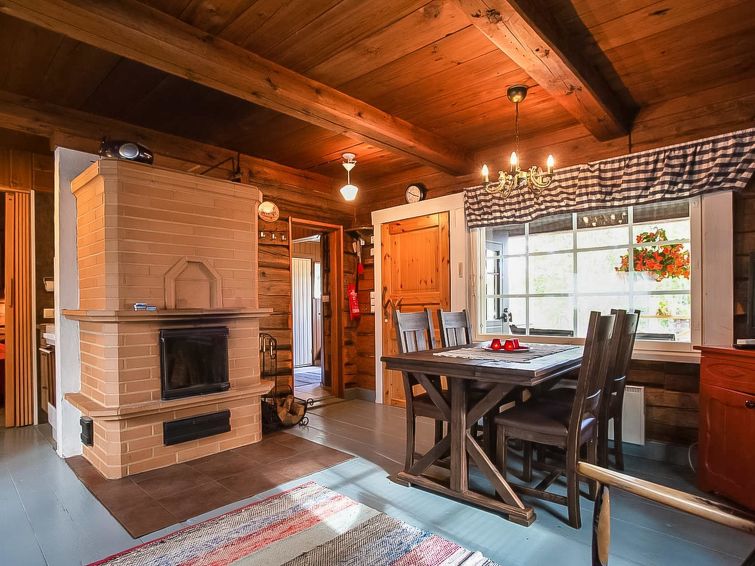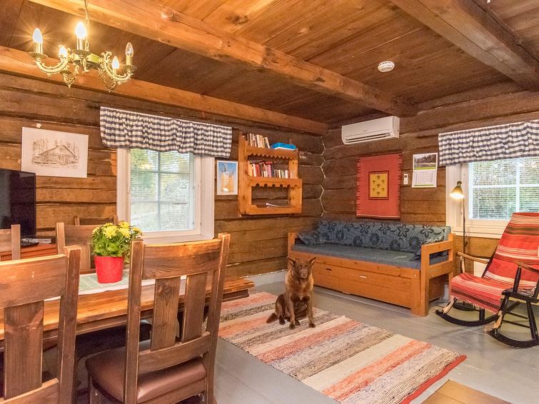 Log cabin 1978, renovated 1998, living room/kitchen, bedroom with double bed, sauna, washroom (shower and wc), dressing room, open veranda. Upstairs: bedroom with 2 beds, hall. Air source heat pump.