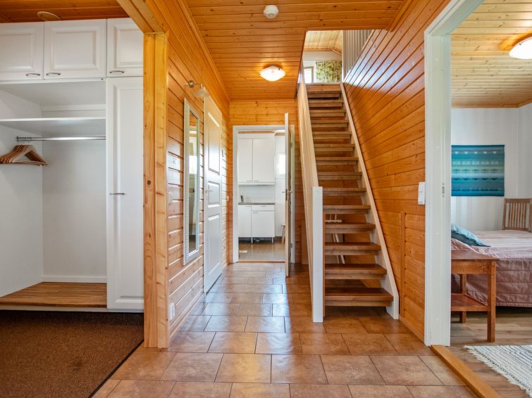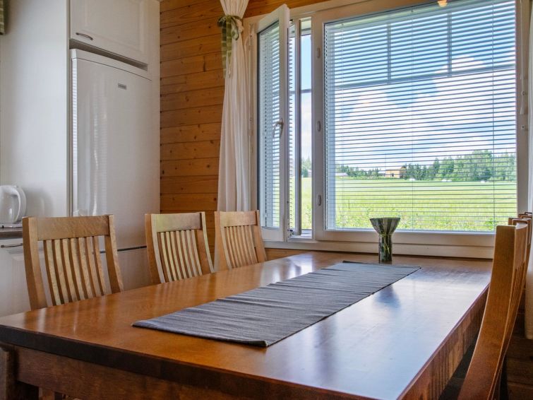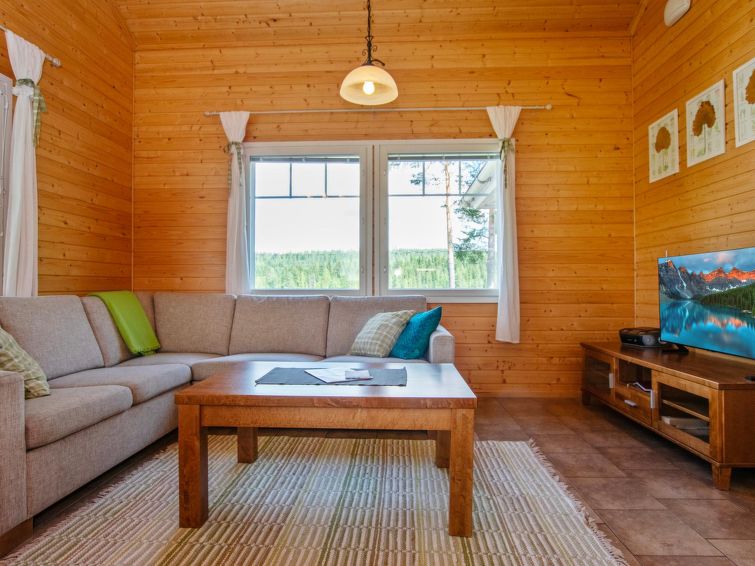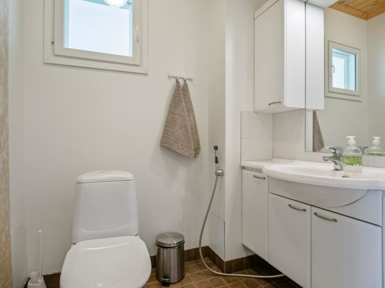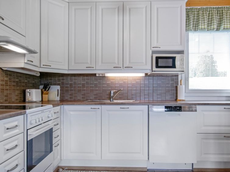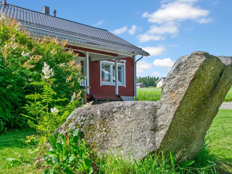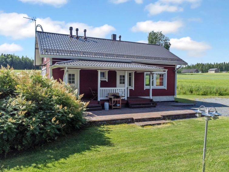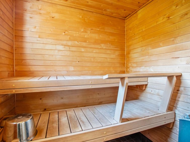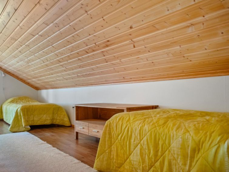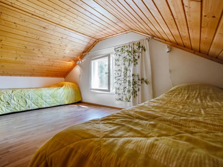 Wooden chalet 2010, living room/kitchen, bedroom double bed, hall, utility room, washroom, sauna (electric stove), in sleeping loft (sloping ceilings, maximum height 1.7 m) 4 beds, open terrace. Building has mechanical ventilation, downstairs underfloor heating. Gas heated ring burner + Muurikka steel pan as gas grill.