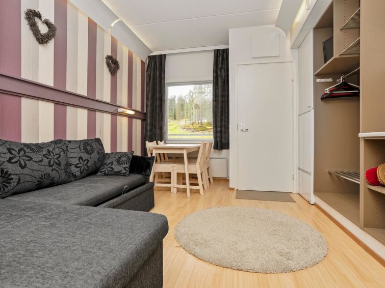 25 km north of Kuusamo, Vuosseli (Eastern Ruka) 10 m. Renovated upstairs apartment in former Hotel Omena, built in 2001, renovated in 2007 and 2017, sleeping alcove: double bed for 2, livingroom: sofabed, combined kitchen/livingroom. No sauna. Apartment is located by the Vuosseli slopes.