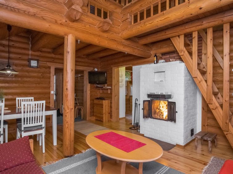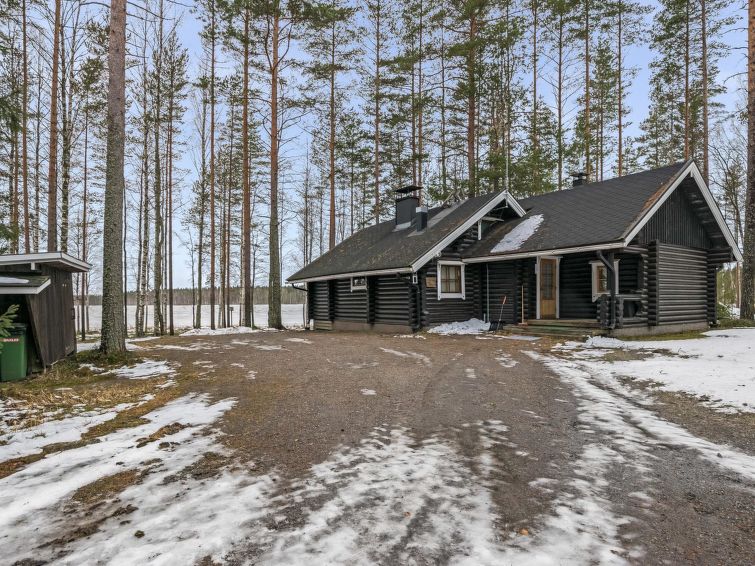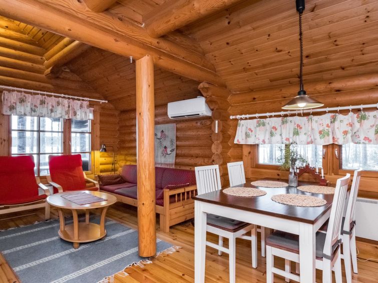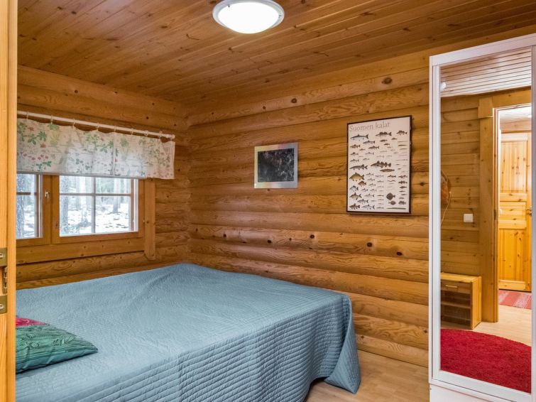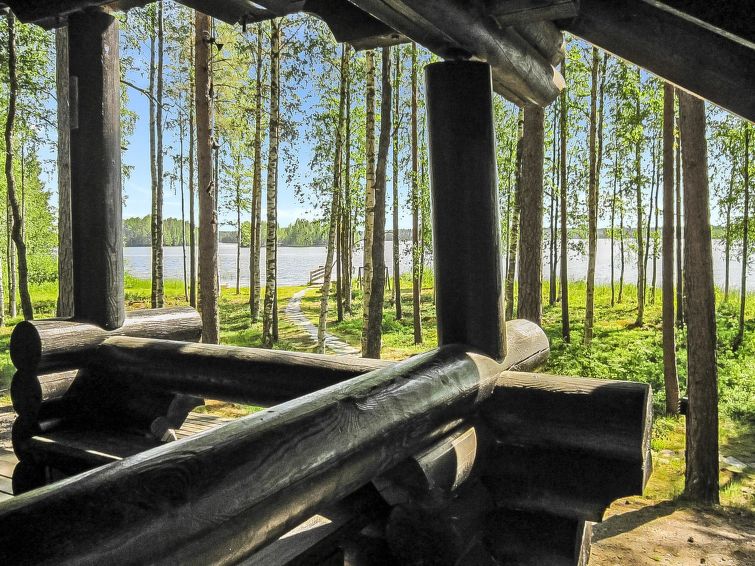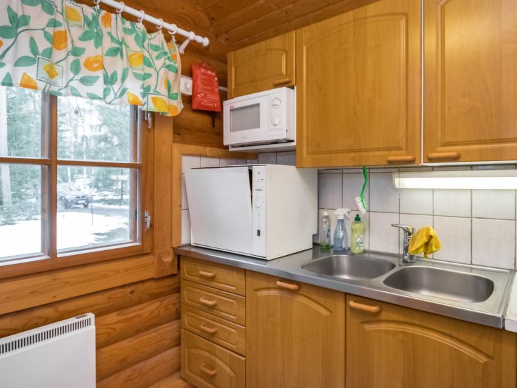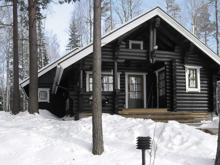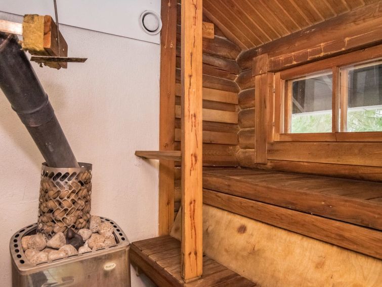 Log cabin 1984, expanded and renovated 2000, kitchenette, living room with spreadable sofa (two extra beds), bedroom (10 m²) with double bed, separate WC, dressing room, washroom, sauna, covered porch.