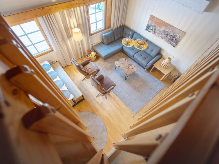The apartment is spread over two floors. On the ground floor, there is a spacious living room/kitchen, a bedroom with two beds, a sauna, a bathroom, and a separate WC.