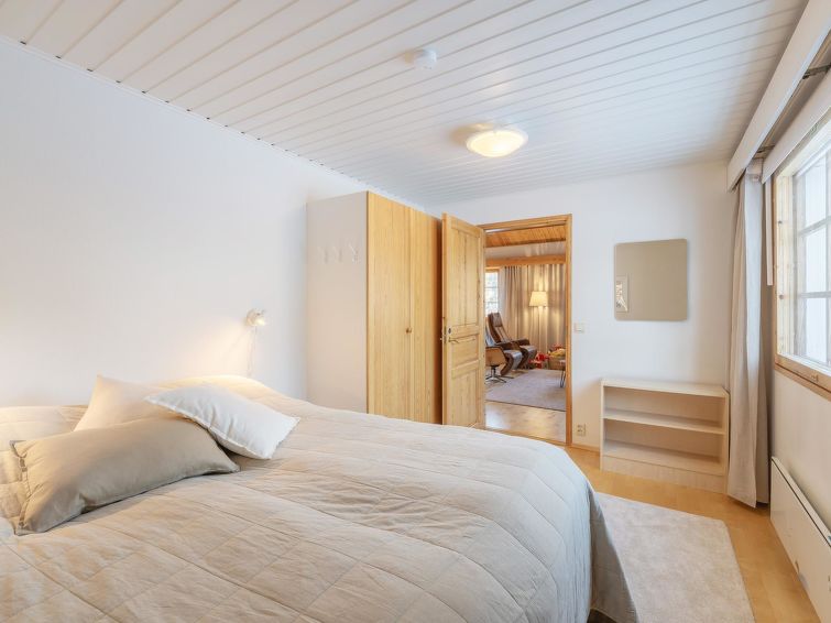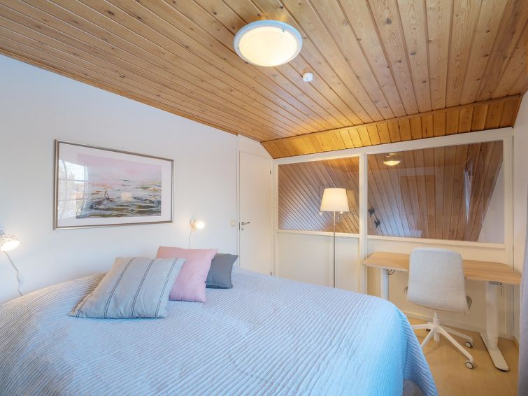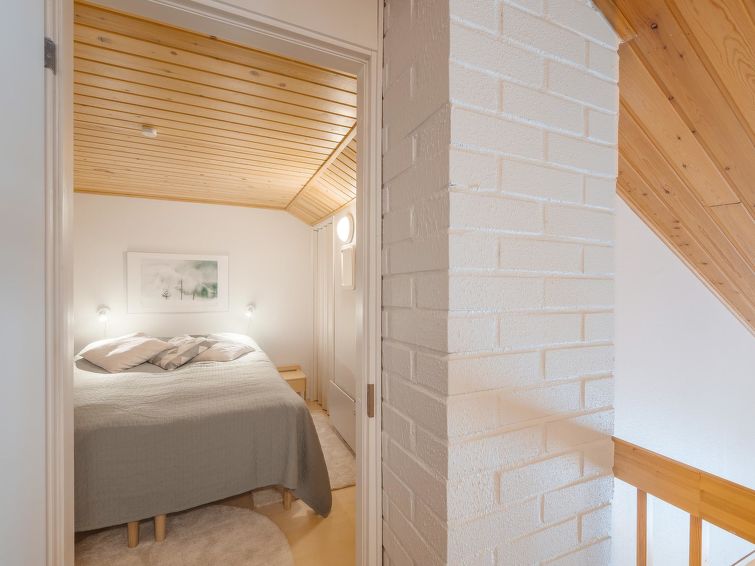 On the upper floor, there are two bedrooms, each with two beds. One of the bedrooms also has access to WC. There is also a loft with a sofa bed. Access to the bedrooms is through the loft. The upper floor also has two walk-in closets.