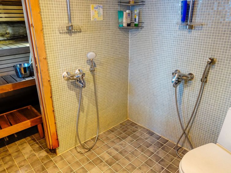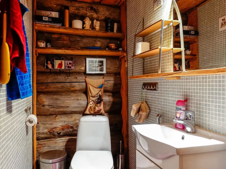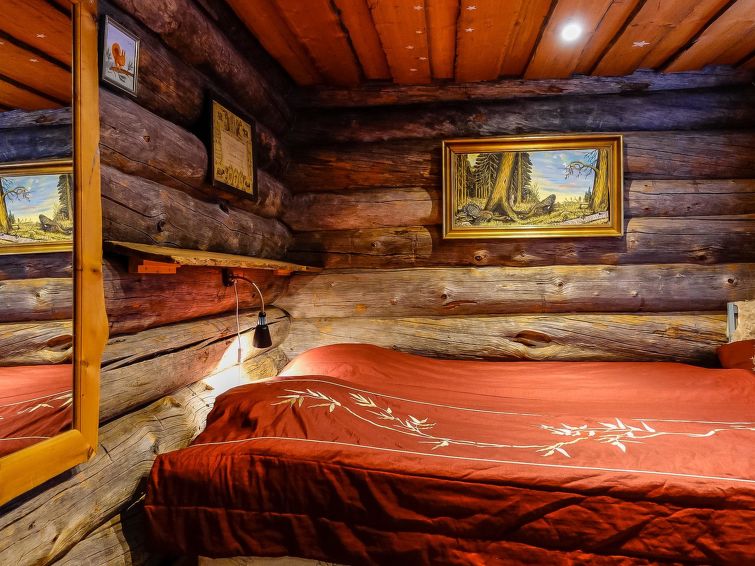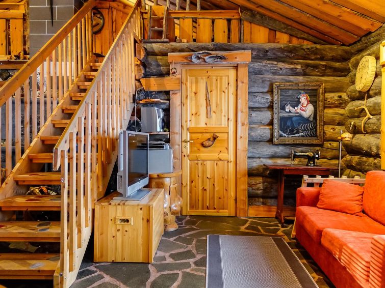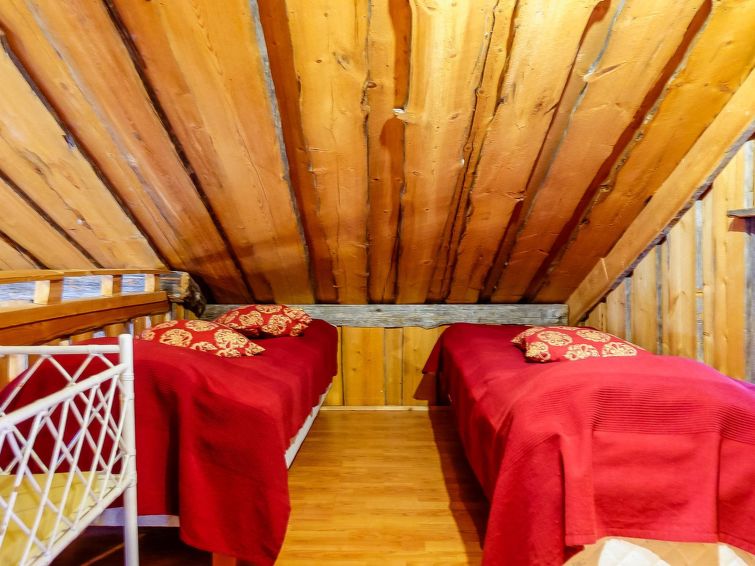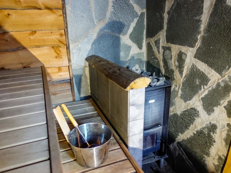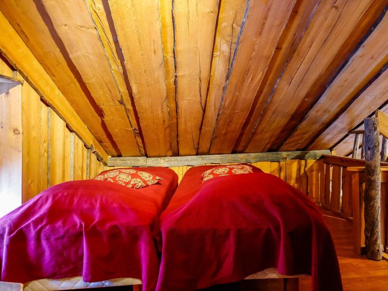 Kelo log cabin, built in 2006. Living room/kitchen, two bedrooms, both with two beds, four beds in the loft, sauna (both electric and wood-burning sauna stoves), washroom/WC, dressing space and covered terrace.
