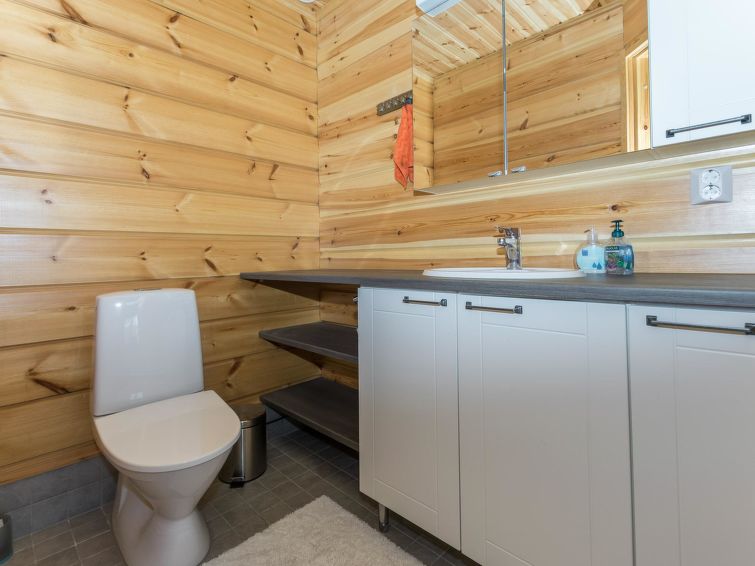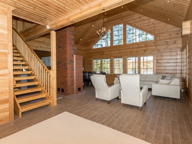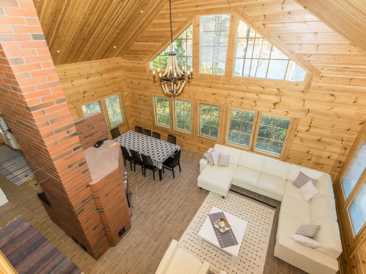 Spacious two-story log house 2017, downstairs vestibule, hallway, technical space, big living room with dining area, separate toilet, well equipped kitchen (access to the terrace), utility room, washroom with toilet, sauna (electricity), bedroom with double bed (access to the terrace), bedroom with 2 beds, 2 terraces.