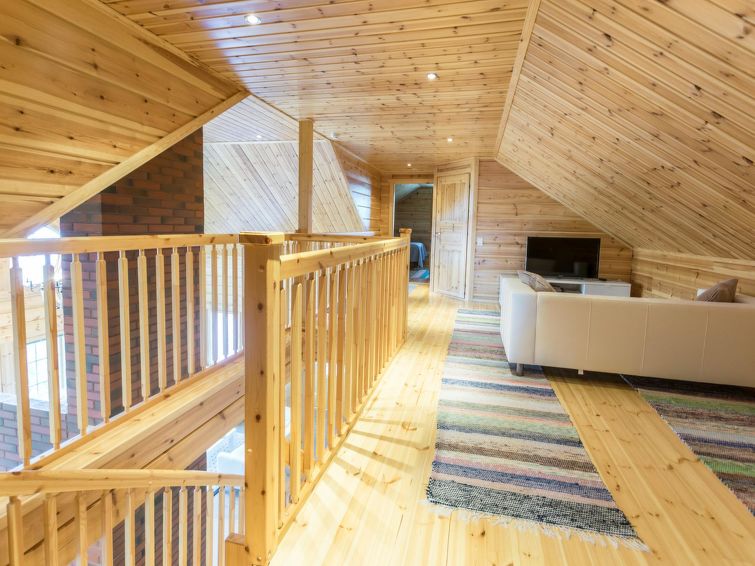 Upstairs stairs, living room with TV, bedroom with double bed (access to balcony), bedroom with 2 beds.