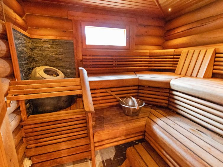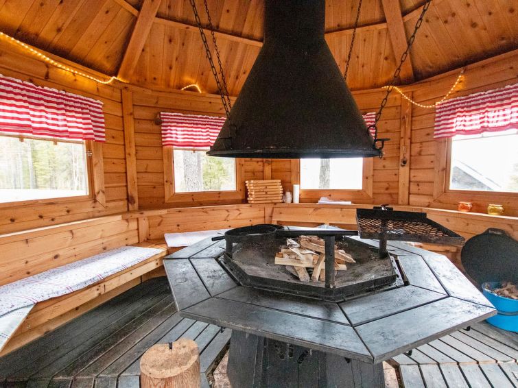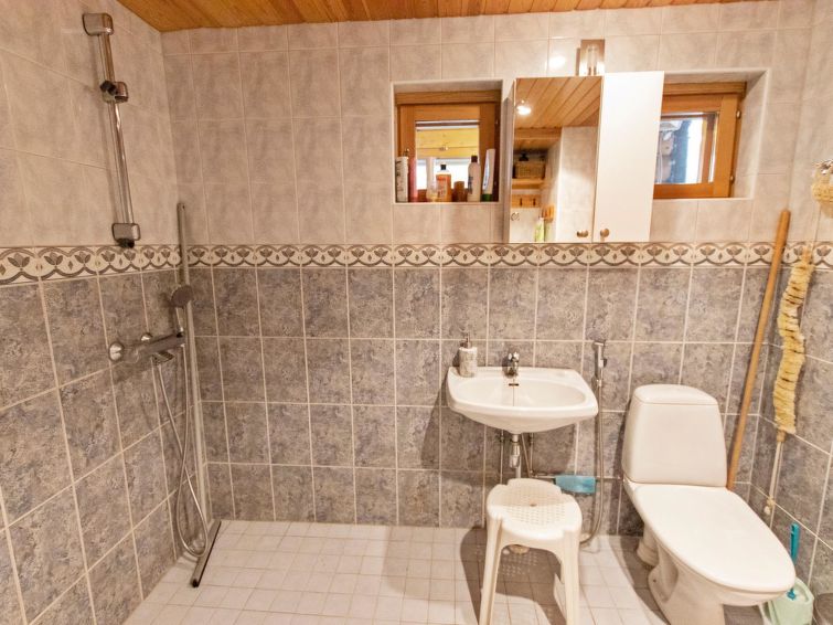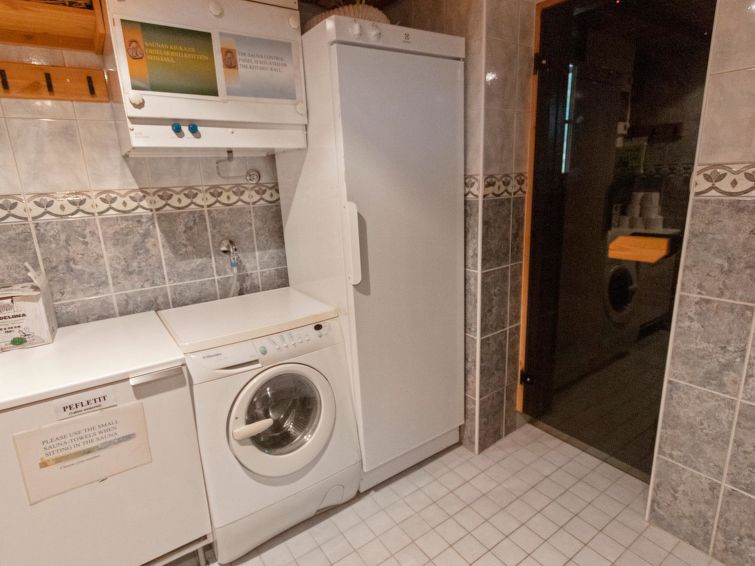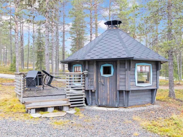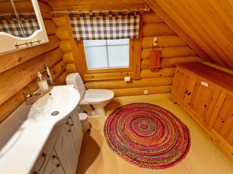Separate log cottage located 40 km north of Kolari in the Äkäslompolo village central area, built 2002. Area 121 m² of which 44 m² on the loft. Downstairs: livingroom/kitchen, bedroom with double bed, electric sauna, bathroom/toilet. Upstairs: bedroom with double bed (140 cm wide), bedroom 2 beds, lobby with two extendable bed sofas, separate toilet. Heated ski maintenance room and two pairs of snow shoes, kick sled, bicycle and grill hut in the yard for the customers' use. WiFi.