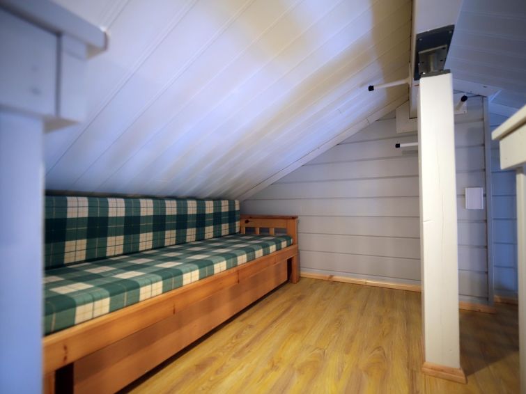 Bedrooms: one bedroom downstairs has a double bed and the other has 2 beds (one of the beds is pulled out from under the regular bed). In the loft there are 2 beds and a sofa bed. Steep stairs to loft.