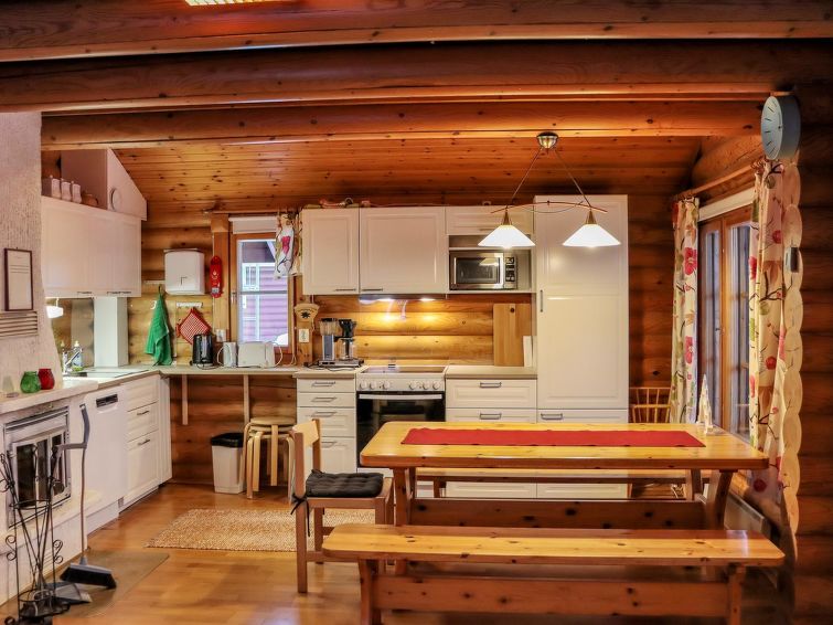 Possibility for electric car charging. Power plug in the cottage. Ukkohalla: Tourism centre located by Lake Syväjärvi, with an information centre, store, restaurant, spa, slope centre, snowmobile tracks, ski tracks, programme services, beach (further information at www.ukkohalla.fi). Distance to the Ukkohalla services 0.5 km. Kajaani airport 86 km, Oulu 170 km, Helsinki 650 km, bus stop Hyrynsalmi 18 km, railway station Kontiomäki 66 km.