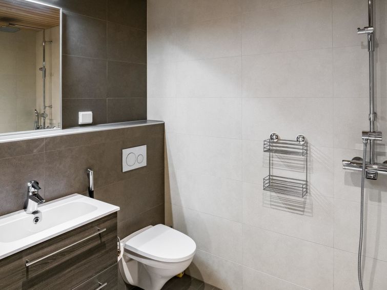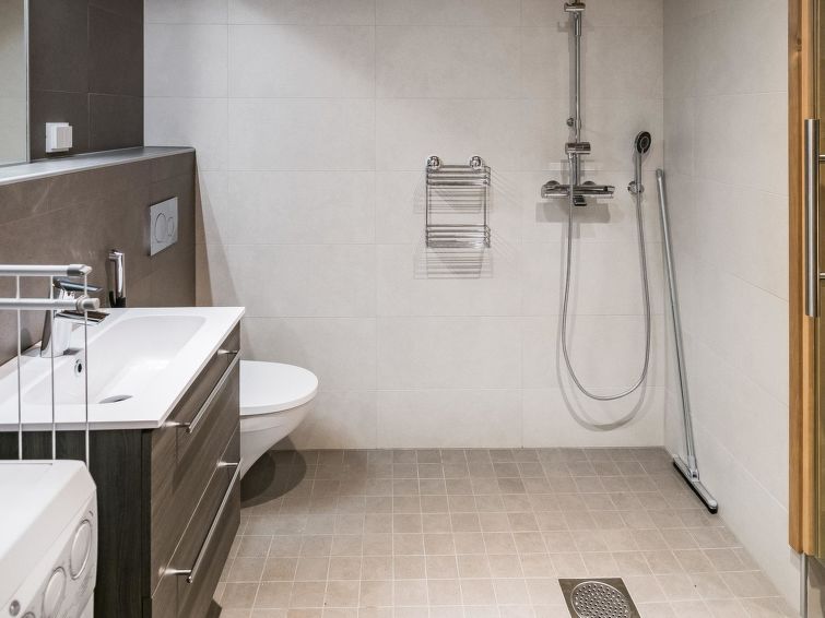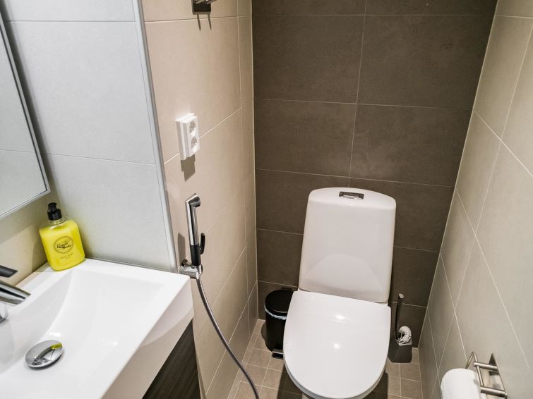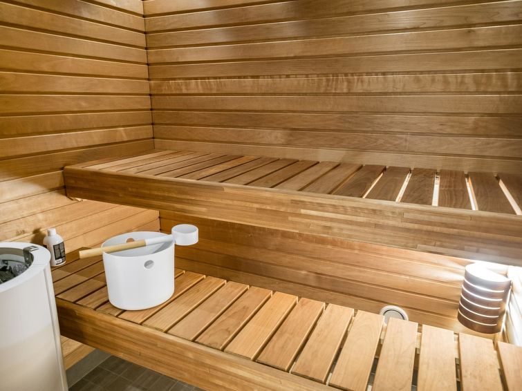The living room and dining area are spacious, cohesive spaces. You can enjoy the atmosphere by the fireplace in the living room, and you can easily admire the views from the spacious balcony. Extra beds for sleeping can be obtained by opening the living room sofa. The bathroom with sauna offers a great possibility to relax. The apartment also has a separate toilet.