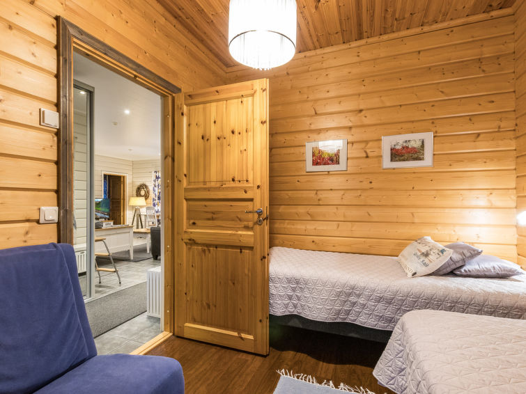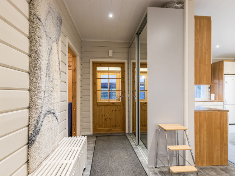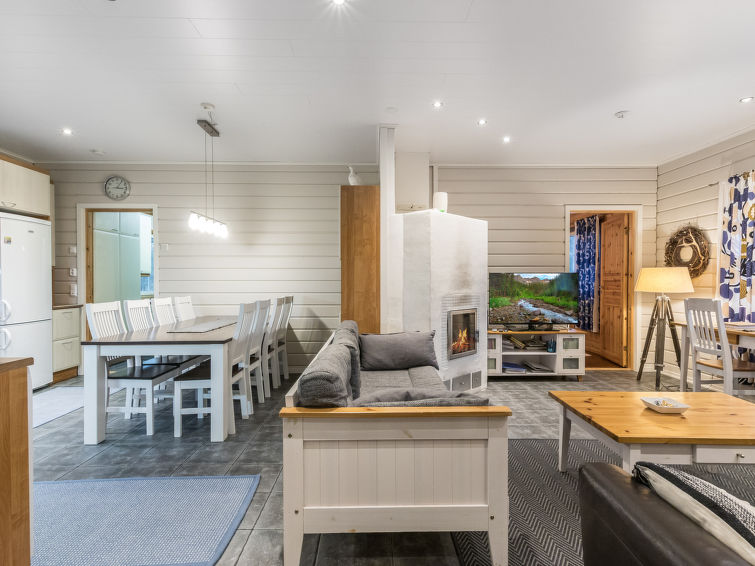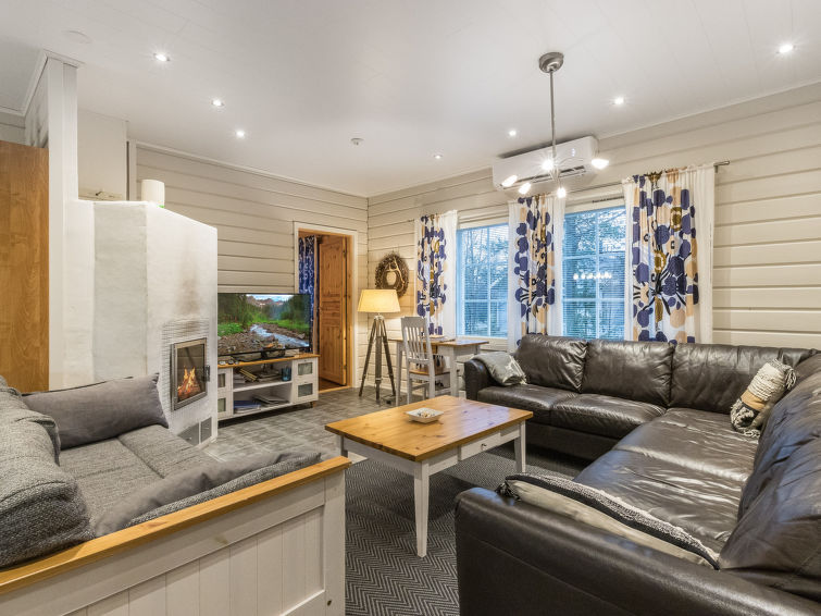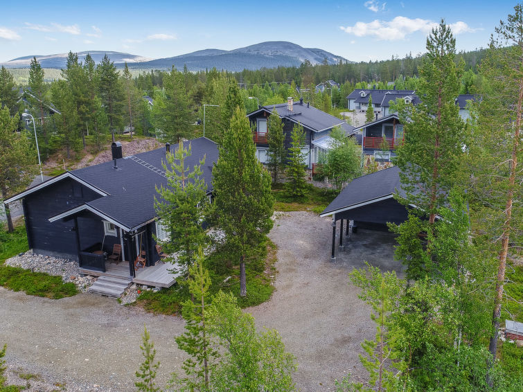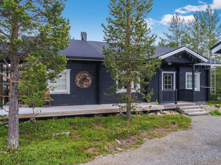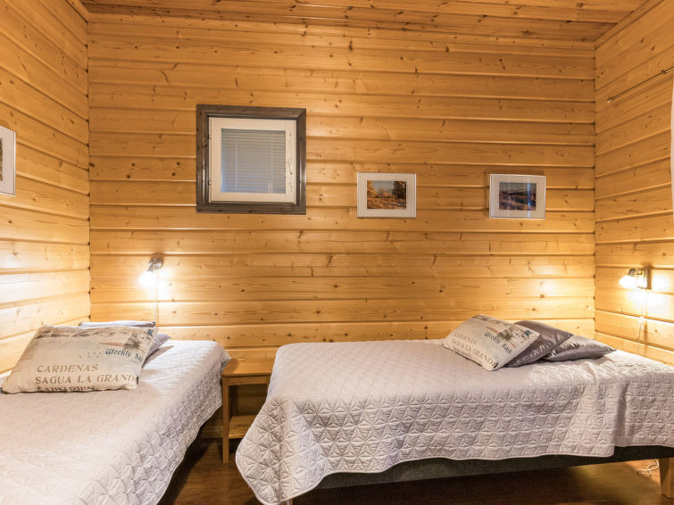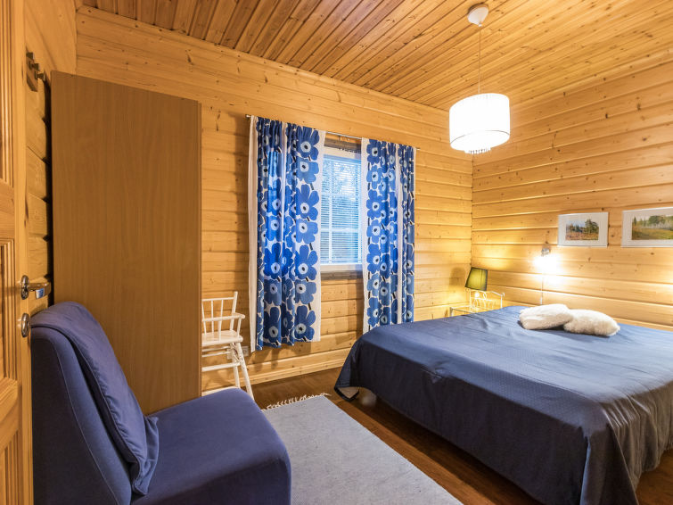 40 km north of Kolari, lake Äkäslompolo 2,1 km, swimming beach 2,7 km.Log cottage, built 2007. Livingroom/kitchen with wooden sofa, three bedrooms, two with a double bed and one with two separate beds, electric sauna, shower/toilet, separate toilet. Ski maintenance room, car shelter and storage room. Well-equiped and homely log cottage located in the Äkäslompolo village Maahinen area (address: Maahisentie 14). Apartment is situated in a new cottage area between the slopes and Äkäslompolo village. Light skiing track near. In addition: nursery equipment (baby cot, potty, feeding chair), DVD-player, CD-player. No pets allowed.