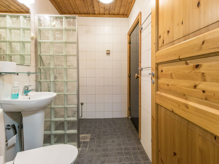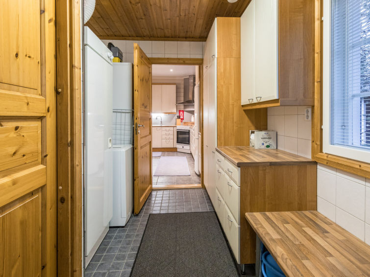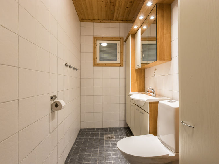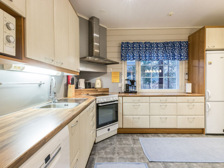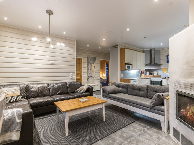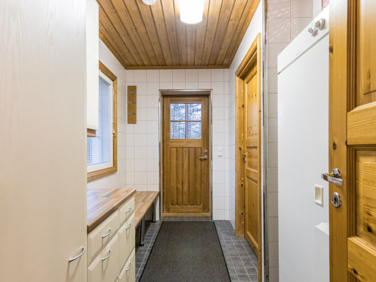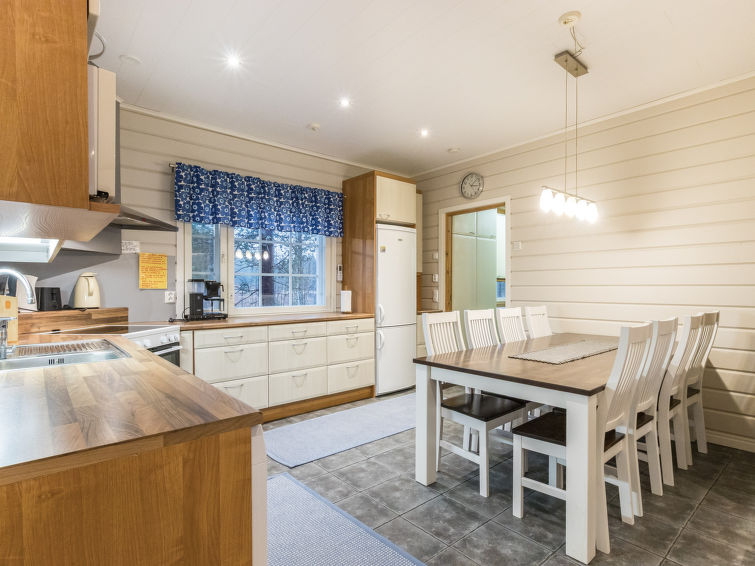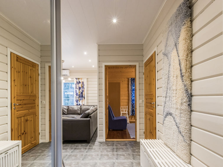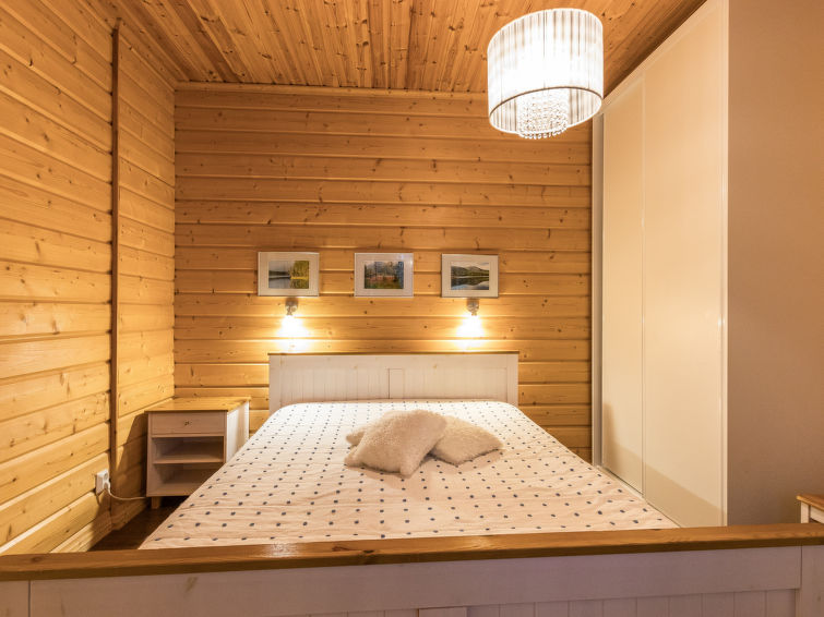40 km north of Kolari, lake Äkäslompolo 2,1 km, swimming beach 2,7 km.Log cottage, built 2007. Livingroom/kitchen with wooden sofa, three bedrooms, two with a double bed and one with two separate beds, electric sauna, shower/toilet, separate toilet. Ski maintenance room, car shelter and storage room. Well-equiped and homely log cottage located in the Äkäslompolo village Maahinen area (address: Maahisentie 14). Apartment is situated in a new cottage area between the slopes and Äkäslompolo village. Light skiing track near. In addition: nursery equipment (baby cot, potty, feeding chair), DVD-player, CD-player. No pets allowed.