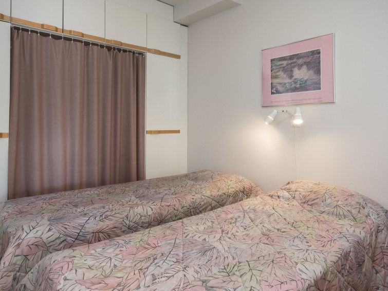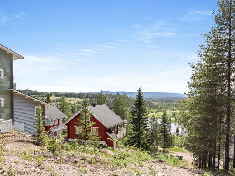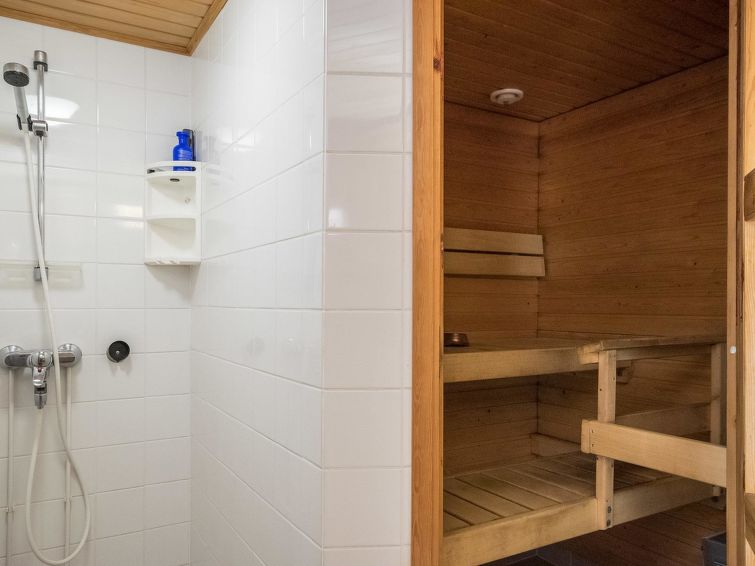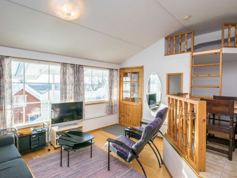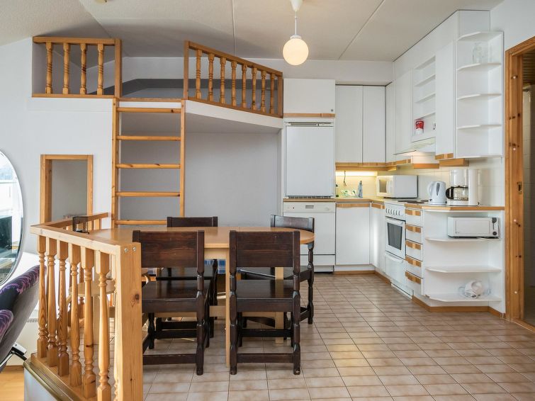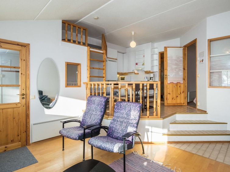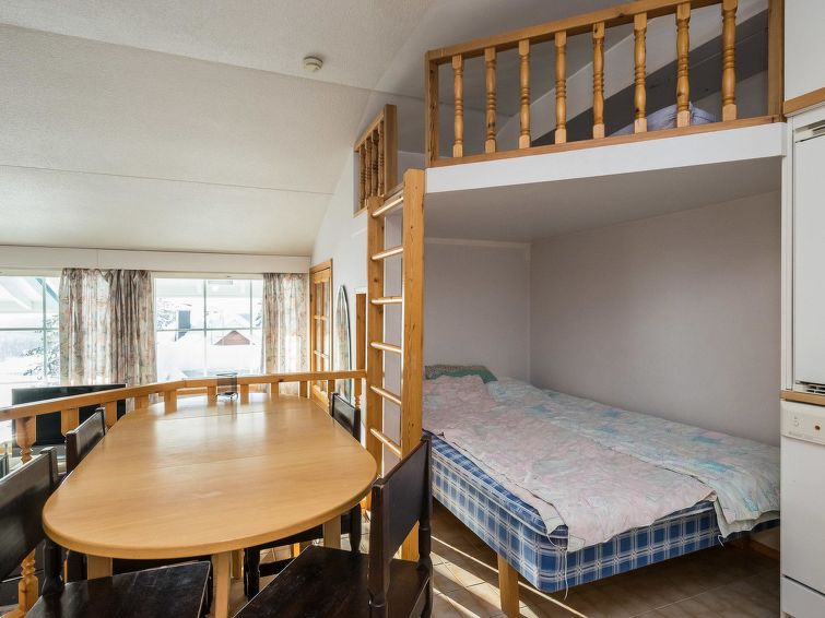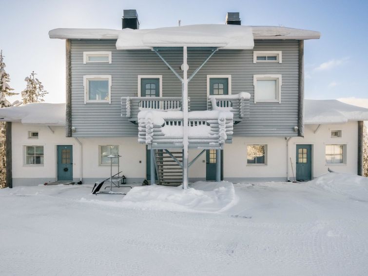A loft house downstairs apartment located in the Ukkohalla tourism centre (apartments on 3 floors) 47m², built in 1992, kitchen, one bedroom, one sleeping corner, small loft, sauna, shower room/toilet, vestibule, balcony. 2 beds in the bedroom, double bed in the sleeping corner, sofa-bed and a mattress on the loft. An outdoor grill in summer use.