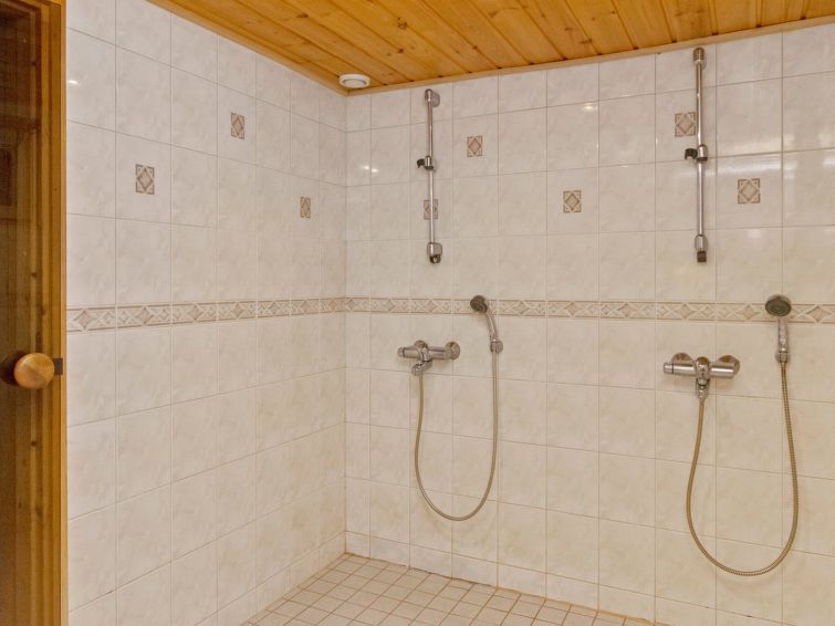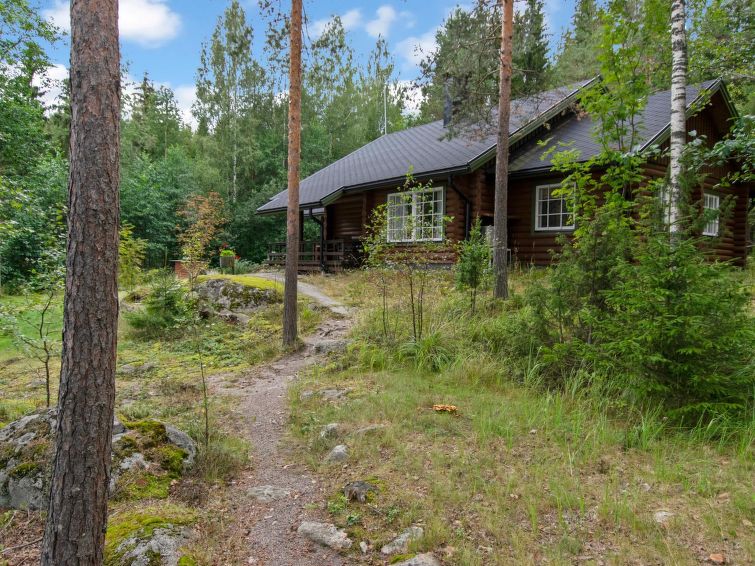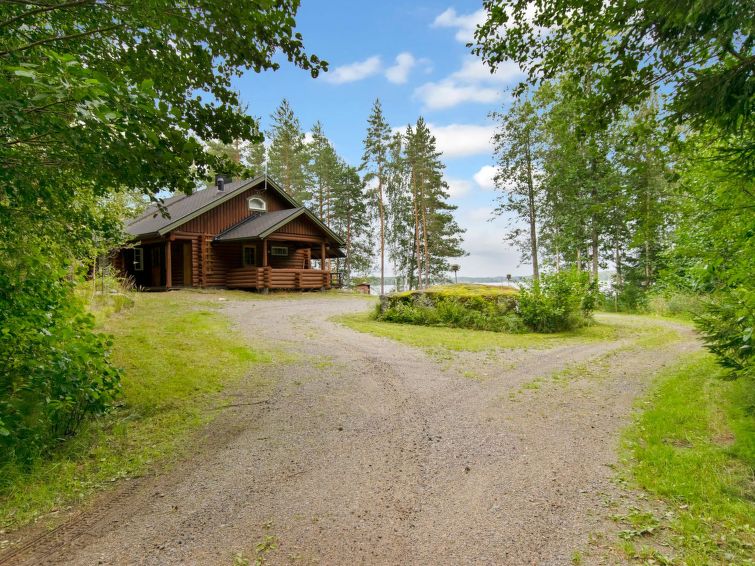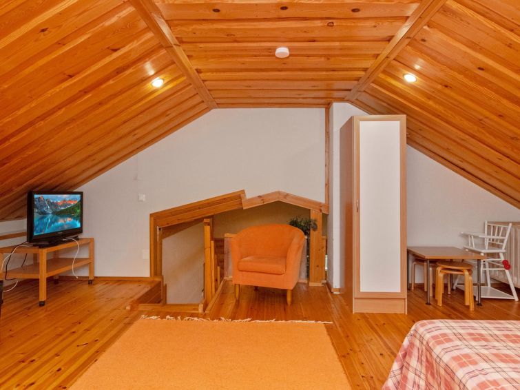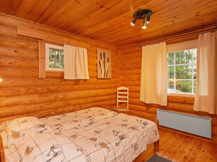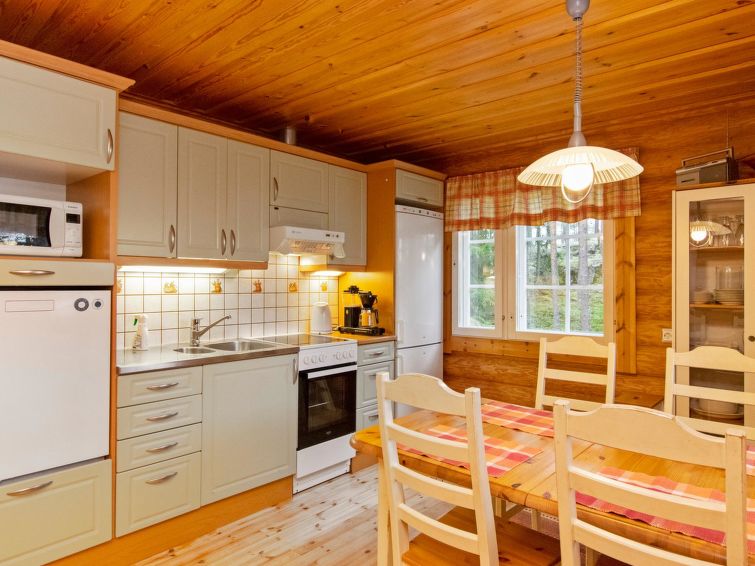 Round log cabin 2002, kitchen, living room, two bedrooms, each with two beds, utility room, washroom, wood-burning sauna stove in the sauna, separate WC. Two beds on the upper floor. Covered terrace 28 m².