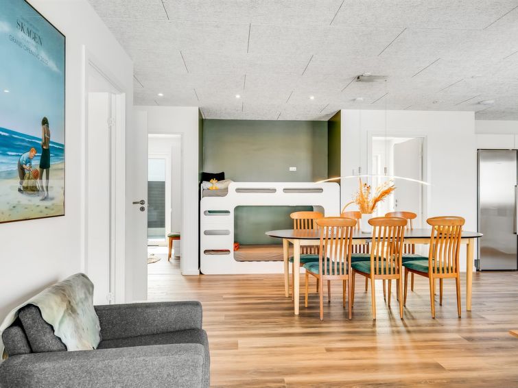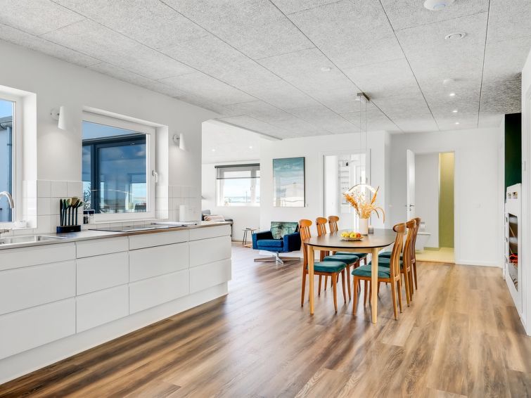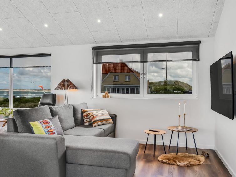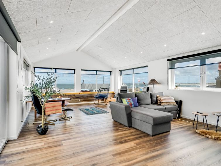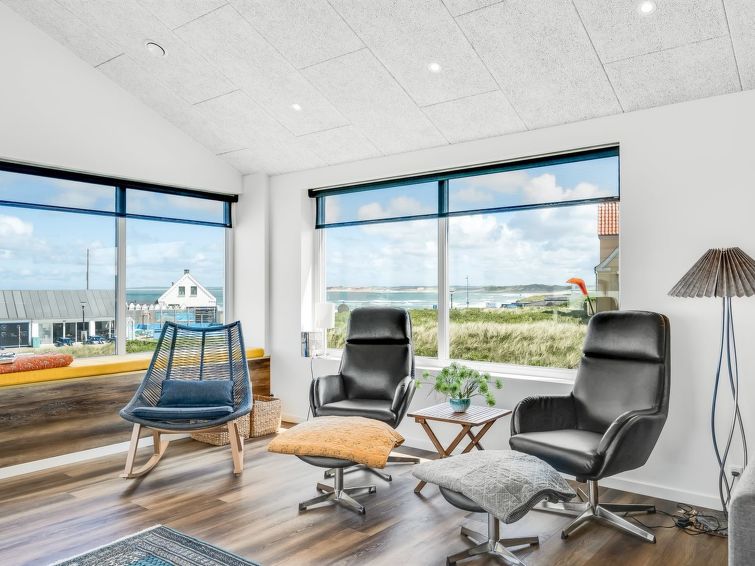 "Unge" - 75m from the sea in NW Jutland", 4 rom hus 136 m2. Passer for 8 voksne + 1 barn. Stue med, 1 dobbel sovesoffa og TV. 1 rom med, 1 dobbeltseng. 1 rom med, 1 dobbeltseng. 1 rom med 2 senger. Kjøkken (stekeovn, oppvaskmaskin, 4 induksjonskomfyr, mikrobølgeovn, frys). 2 dusjer/WC. Utsikt av havet. Fasiliteter: høy barnestol barneseng (ekstra). Internett (trådløs LAN [WLAN]). Vennligst merk: røykfri bolig. Max kjæledyr/små hunder tillatt 2 kjæledyr/små hunder tillatt.